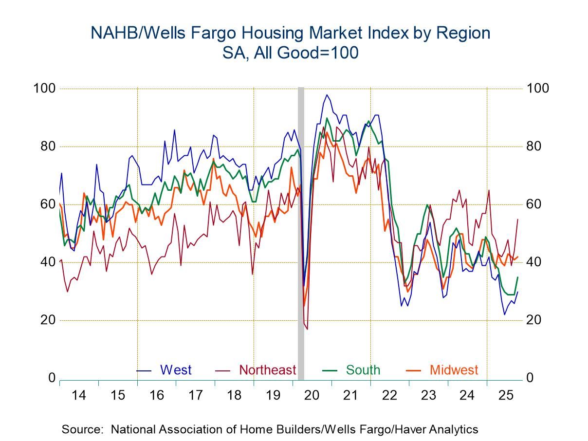 Housing improvement occurred throughout the country last month. The sales index in the Northeast jumped 25.0% (5.8% y/y) to 55 after rising 12.8% in September. In the Midwest, the sales index rose 2.4% (-2.3% y/y) to 42 after declining 2.4% in September. In the South, the index rose 20.7% (-18.6% y/y) to 35 after holding steady in September. In the West, the index rose 15.4% (-31.8% y/y) to 30 after falling 3.7% in September.