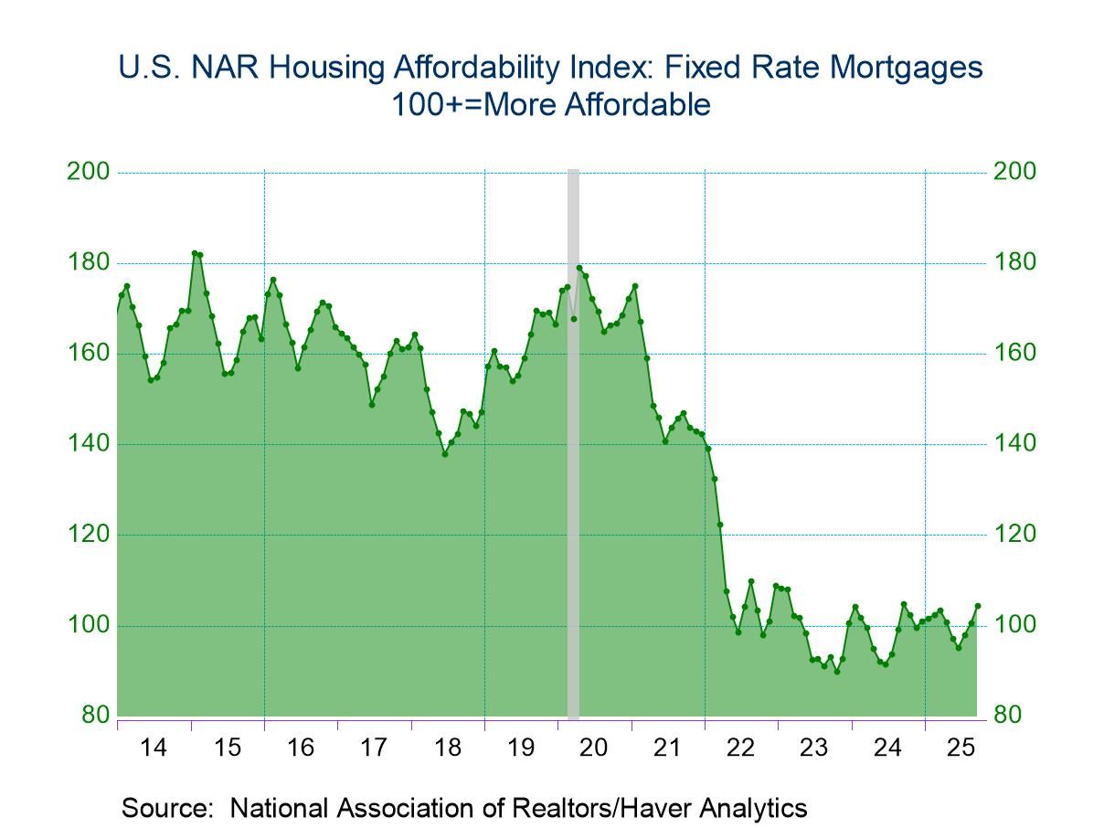 The National Association of Realtors' Fixed Rate Mortgage Housing Affordability Index (HAI) increased 3.9% (-0.3% y/y) during September to 104.5 after rising 2.8% in August and 2.9% in July. The index roughly equaled the recent high of 104.8 in September of 2024. The level of home affordability was 16.2% higher than its low of 89.9 in October 2023, but remained 41.6% below the high of 179.0 in April 2020.