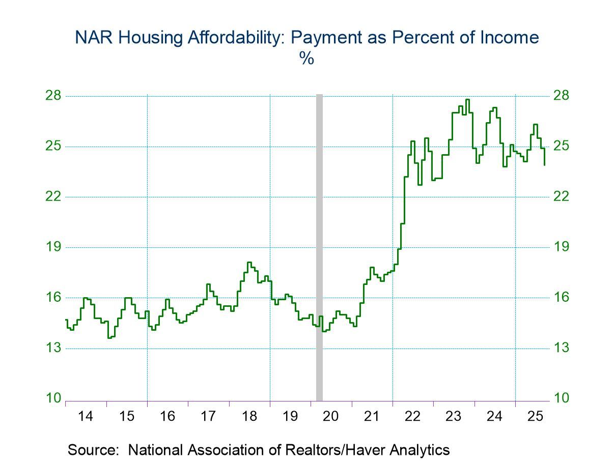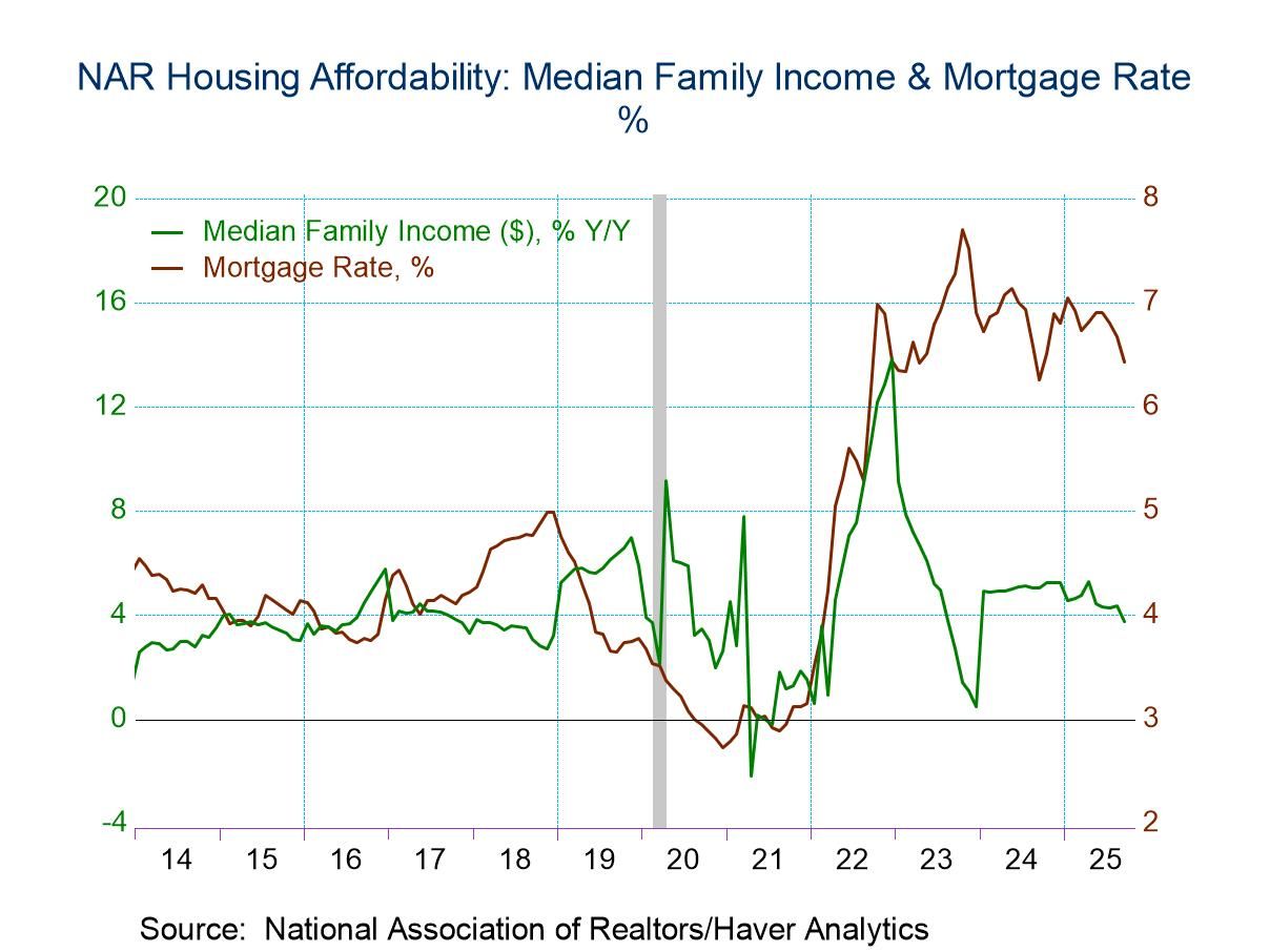 The rise in September affordability occurred as the median price of an existing single-family home fell 1.6% (+2.3% y/y) to $420,700. The price compared to the record $438,600 in June 2025. Mortgage rates fell to 6.43% after declining to 6.67% in August. The fall in mortgage rates left them above their low of 6.26% in September of last year, though below a 7.70% high in October of 2023. They remained well above a December 2020 low of 2.73%.