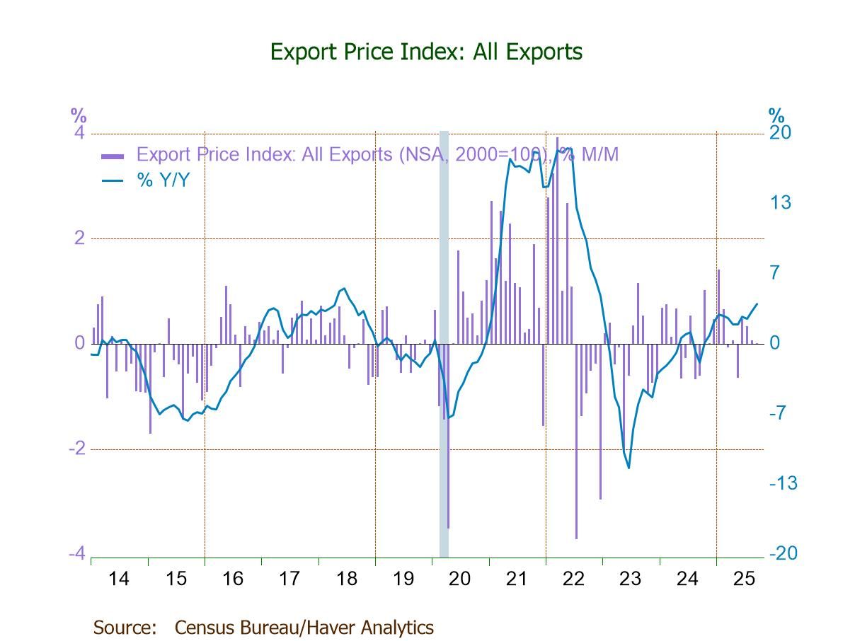 The unchanged m/m export prices in September reflected a rebound in agricultural export prices and no change in nonagricultural export prices. Agricultural export prices rose 0.3% (4.4% y/y) in September after declines of 0.2% in August (0.0% initially) and 0.2% in July (unrevised). Nongricultural export prices held steady m/m (+3.7% y/y) in September after increases of 0.1% in August (+0.3% initially) and 0.3% in July (unrevised). Export prices for capital goods (+2.1% y/y) and industrial supplies & materials (+5.8% y/y) were unchanged m/m in September, while those for foods, feeds & beverages (0.3%; 5.2% y/y), automotive vehicles & parts (0.2%; 2.7% y/y), and consumer goods excluding autos (0.1%; 2.1% y/y) all increased m/m.