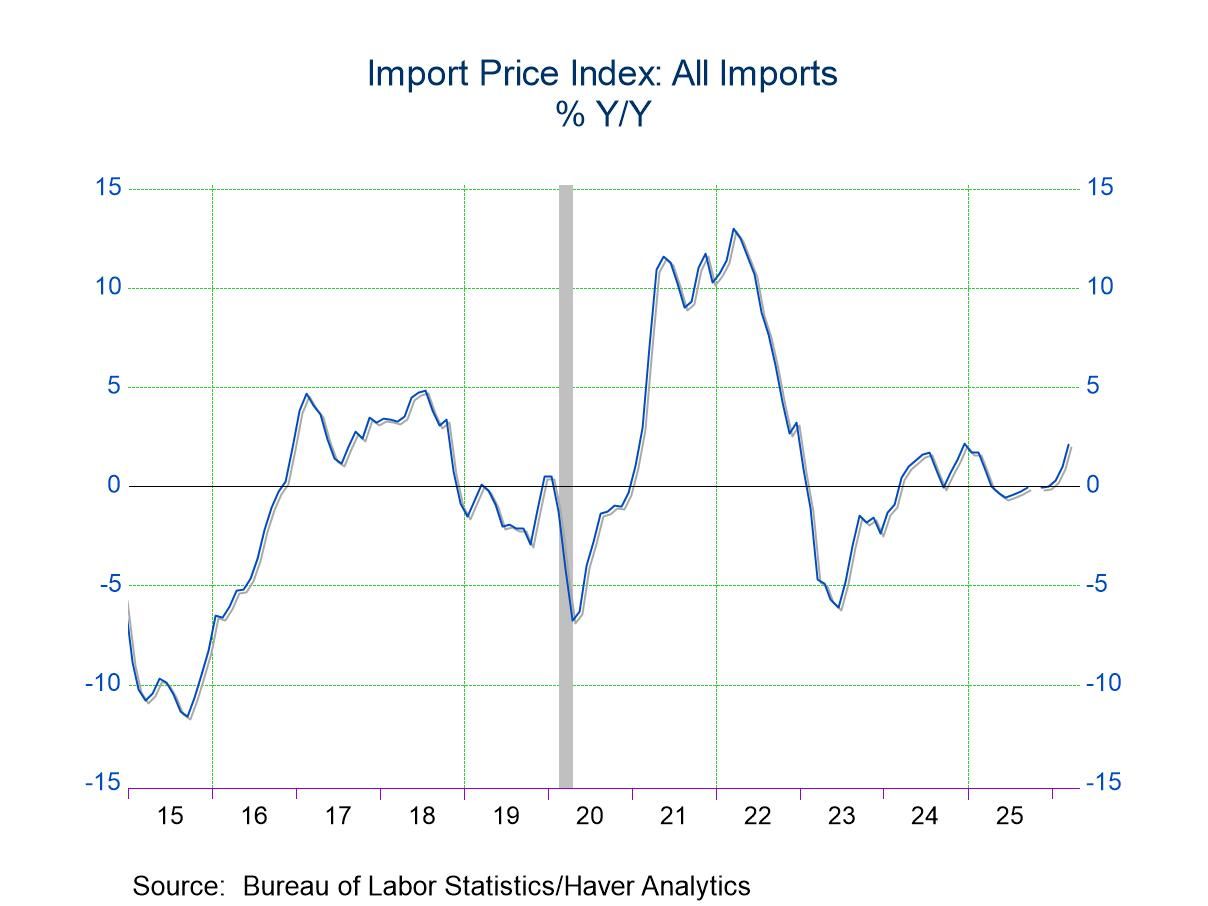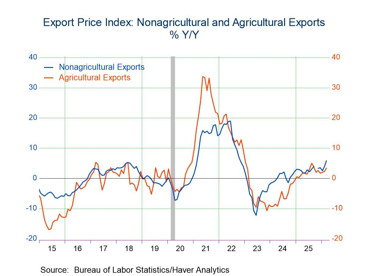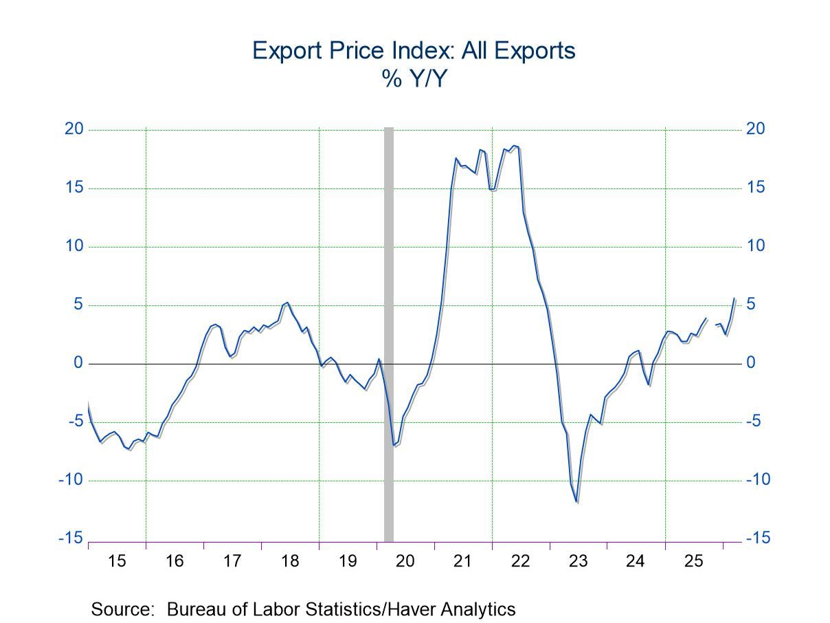 Import prices rose a less-than-expected 0.8% m/m (2.1% y/y) in March notwithstanding a 9.4% monthly jump in imported petroleum and petroleum products prices, according to the Bureau of Labor Statistics. The 1.3% m/m increase previously reported for February was revised down to a 0.9% monthly gain. The Action Economics Forecast Survey looked for a 2.4% m/m increase in March. Export prices rose more than did import prices but also less than expected. They were up 1.6% m/m (5.6% y/y) in March following an upwardly revised 1.9% monthly rise in February. The 5.6% annual gain was the largest since November 2022. The Action Economics Forecast Survey expected a 2.1% monthly increase. (Note: Import and export price indexes are not directly affected by tariffs because they measure the prices of goods before taxes. Tariffs are classified as taxes and therefore are excluded from these calculations. October 2025 data were unavailable due to the U.S. federal government shutdown.)