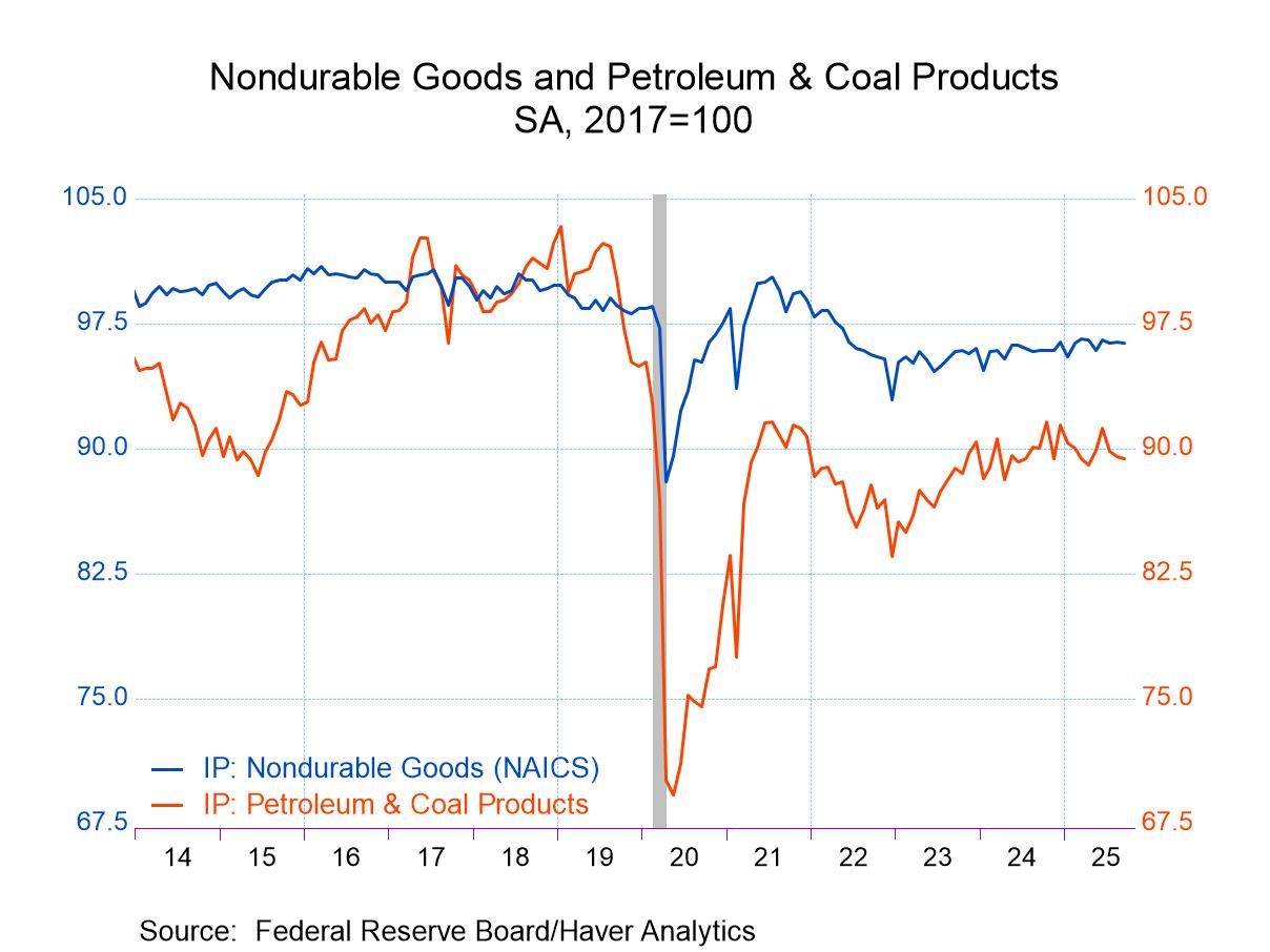 Output of nondurable goods slipped 0.1% m/m (+0.3% y/y) in September, reversing a 0.1% monthly gain in August. Declines were widespread across industry groups, led by a 1.3% m/m drop in printing and related activities. Output of petroleum and coal products fell 0.1% m/m, the third consecutive monthly decline. Chemical output fell 0.2% m/m. By contrast, production of plastics and rubber products increased 0.3% m/m in September on top of a 1.3% m/m gain in August.