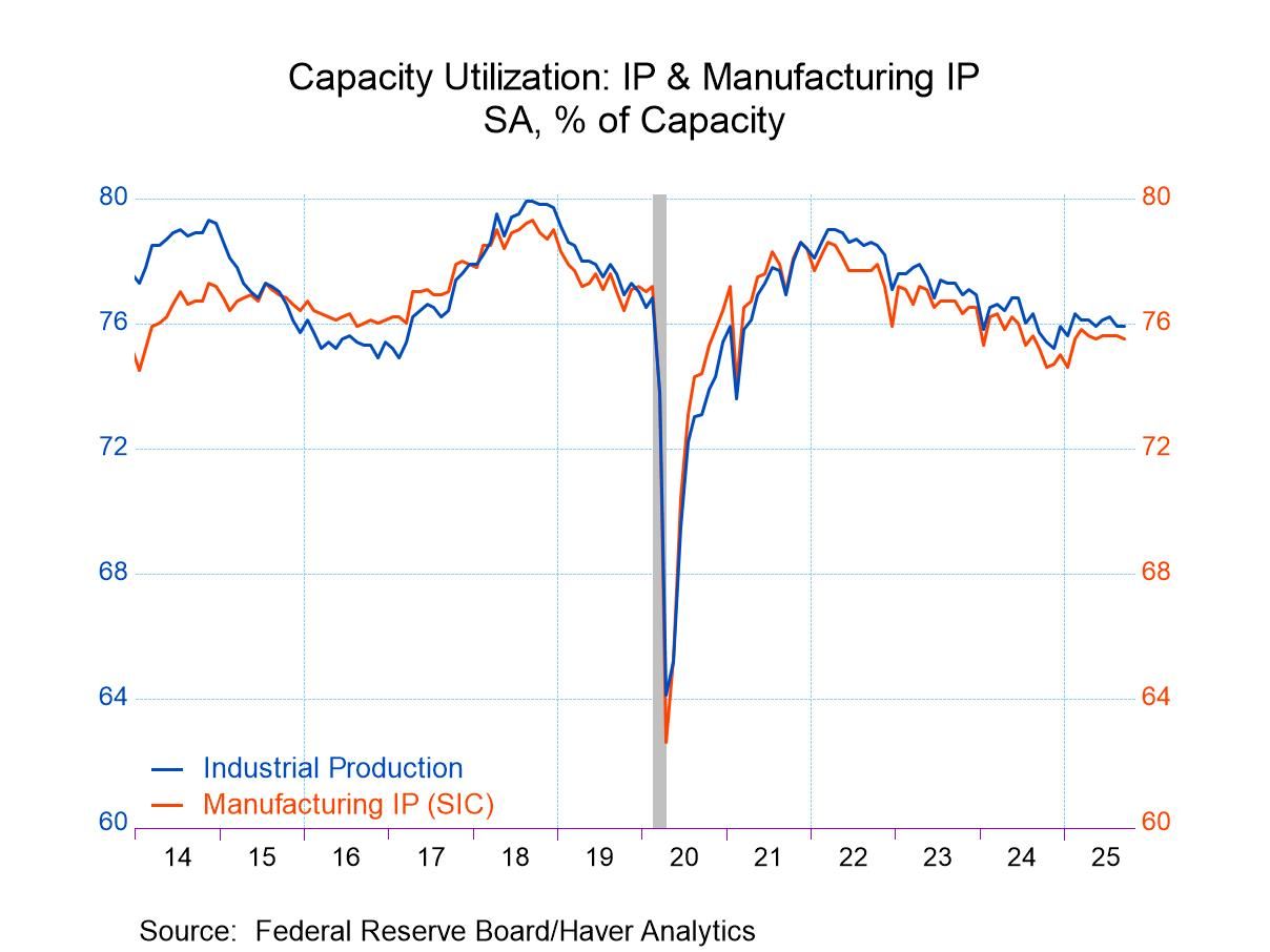 Total industry capacity utilization was unchanged at 75.9% in September. In the manufacturing sector, the utilization rate edged down to 75.5% from 75.6% in August.