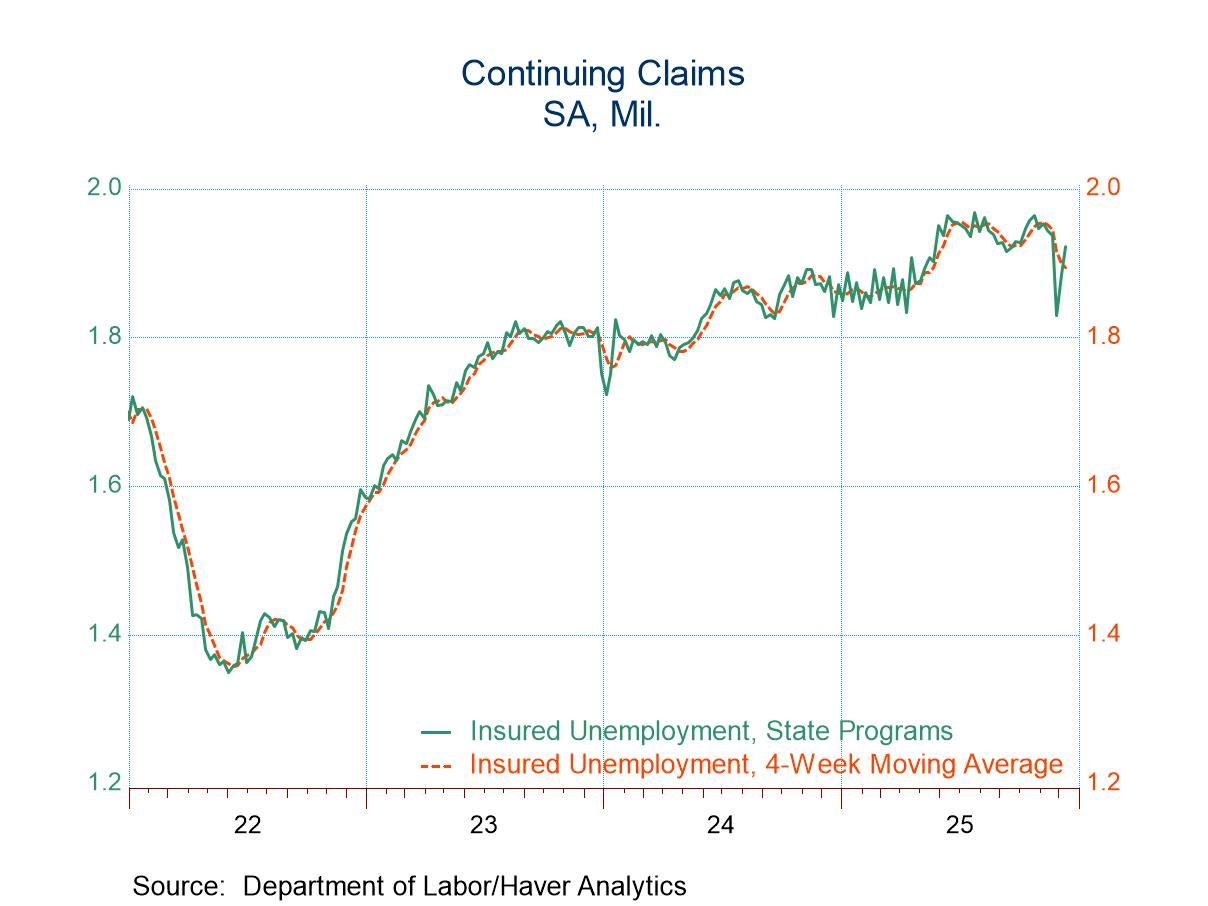 Continuing claims for unemployment insurance rose 38,000 to 1.923 million in the week ending December 13, after rising 55,000 to 1.885 million, revised from 1.897 million in the week ending December 6. The four-week moving average was 1.894 million in the week ending December 13, down 5,250 from 1.899 million, revised from 1,902,000 in the week ending December 6. The insured unemployment rate stood at 1.3% in the week of December 13, up from 1.2% in the week of December 6.