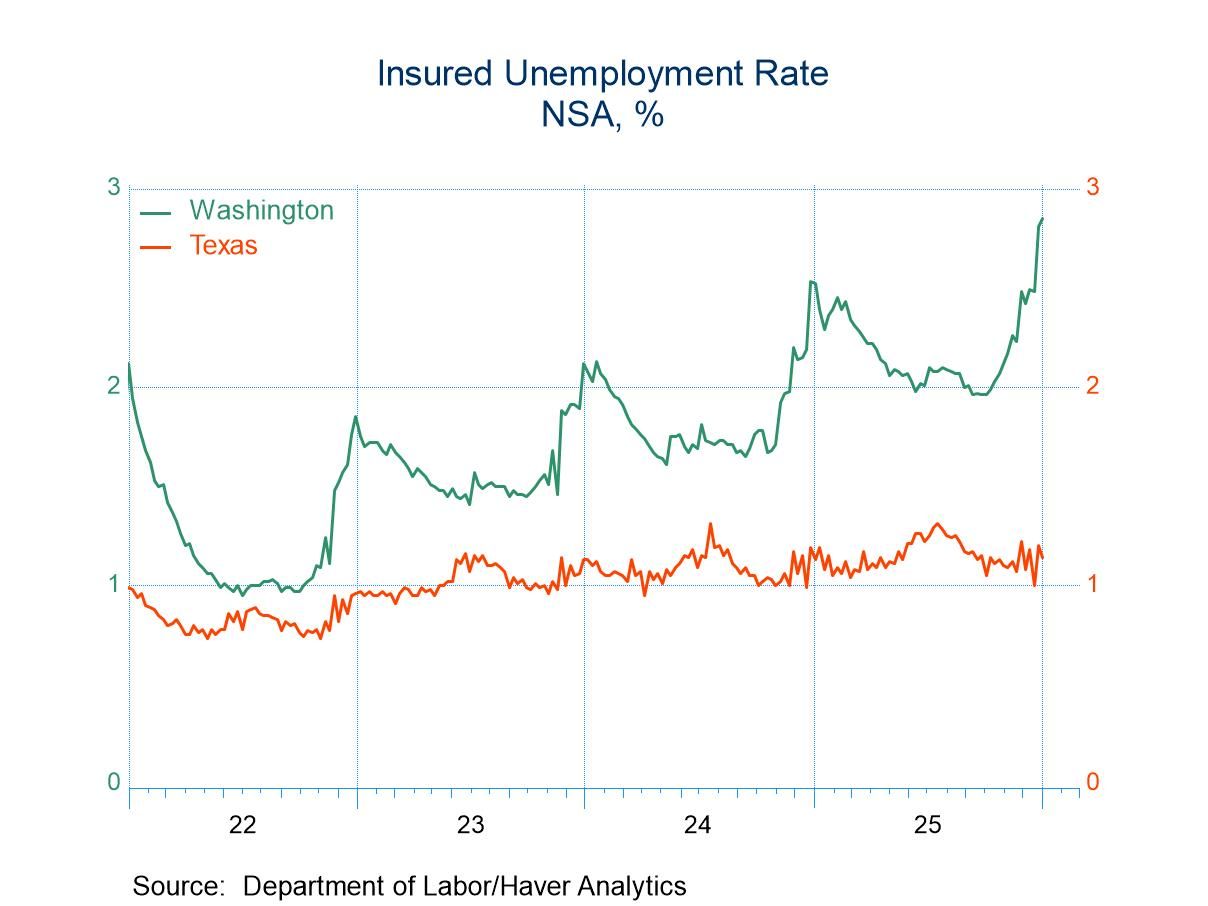 The insured unemployment rate varied greatly across individual states and territories. In the week ending January 3, the highest unemployment rates were in Rhode Island (3.27%), New Jersey (3.17%), Washington (2.85%), Minnesota (2.75%), Massachusetts (2.74%), Oregon (2.37%), Connecticut (2.31%), Montana (2.26%), California (2.21%), and Alaska (2.06%). The lowest rates were in Florida (0.29%), North Carolina (0.40%), and Louisiana (0.43%). Rates in other notable states include New York (2.28%), Pennsylvania (2.23%), Illinois (2.21%), and Texas (1.14%). These state data are not seasonally adjusted.