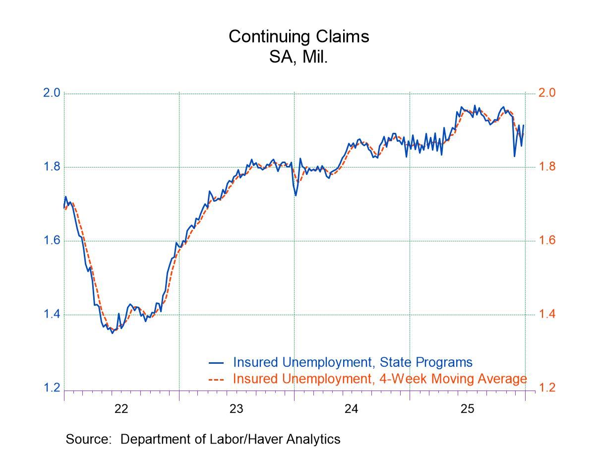 Continuing claims for unemployment insurance rose 56,000 to 1.914 million in the week ending December 27, from 1.858 million in the prior week, revised from 1.866 million. The four-week moving average was 1.893 million in the week ending December 27, from 1.872 million in the December 20 week, revised from 1.873 million. The insured unemployment rate stood at 1.2% in the week of December 27, unchanged from previous week of December 20.