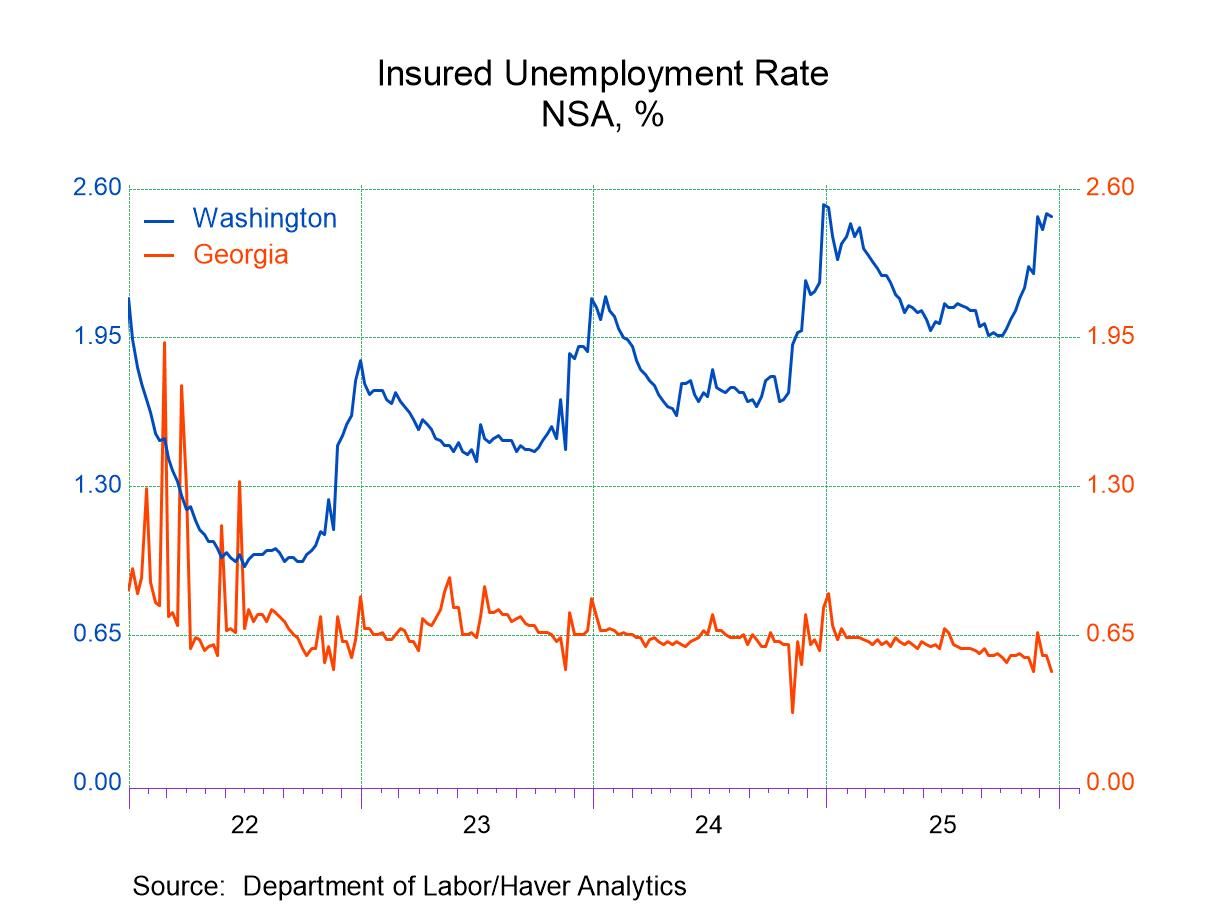 The insured unemployment rate varied greatly across individual states and territories. In the week ending December 20, the highest unemployment rates were in Washington (2.48%), New Jersey (2.38%), Massachusetts (2.27%), and Minnesota and Rhode Island (both 2.22%). The lowest rates were in Florida (0.26%), North Carolina (0.38%), Alabama and Louisiana (both 0.43%), Virgin Islands (0.46%), Virginia (0.47%), and Georgia (0.49%). Rates in other notable states include New York (1.83%), Illinois (1.81%), Pennsylvania (1.72%), and Texas (1.00%). These state data are not seasonally adjusted.