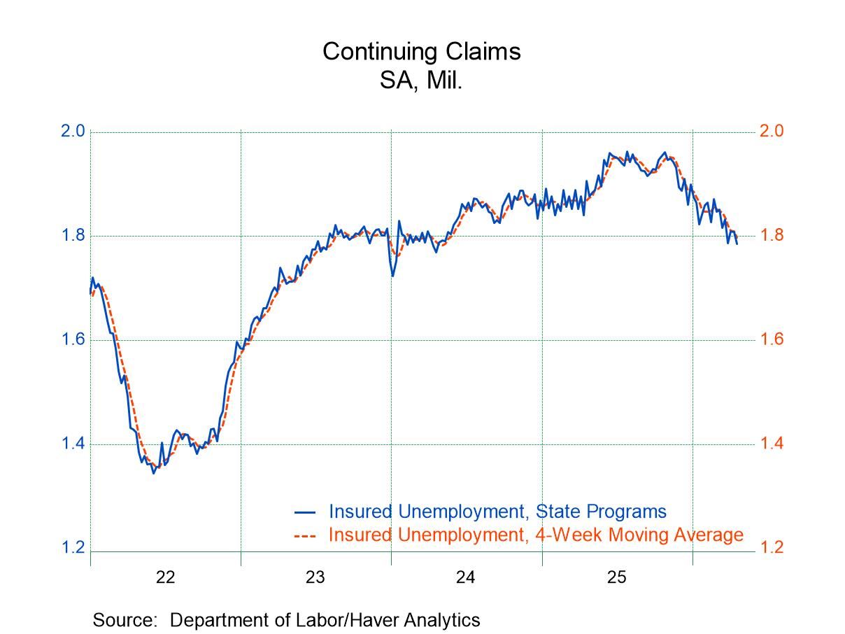 The total number of unemployment insurance beneficiaries—also known as “continuing claims”—dropped by 23,000 to 1.785 million in the week ending April 18, from 1.808 million in the week ending April 11, revised from 1.821 million. The four-week moving average declined to 1.797 million in the latest week from 1.809 million in the April 11 week. The insured unemployment rate remained at 1.2% in the week of April 11. It has remained at that level since the week of November 29, 2025.