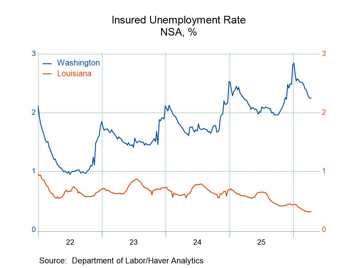 The insured unemployment rate varied greatly across individual states and territories. In the week ending April 11, the highest unemployment rates were in New Jersey (2.51%), Washington (2.25%), Massachusetts (2.21%), Rhode Island (2.10%), and California (2.06%). The lowest rates were in Florida (0.31%), Louisiana (0.32%), Arkansas, North Carolina and Mississippi (all 0.35%), Alabama (0.36%), South Dakota (0.41%) and Tennessee (0.43%). Rates in other notable states include New York (1.96%), Illinois (1.77%), Pennsylvania (1.40%), and Texas (1.04%). These state data are not seasonally adjusted.