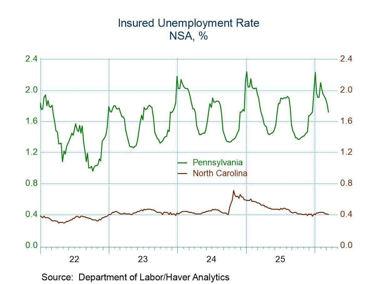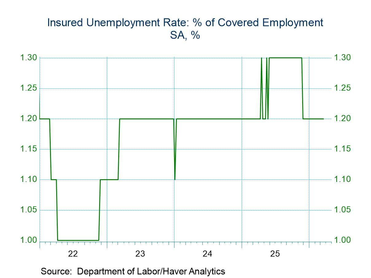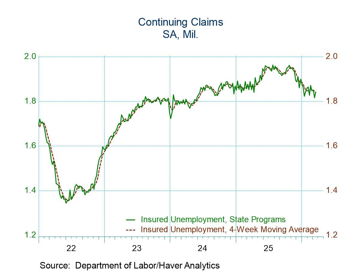 The total number of unemployment insurance beneficiaries—also known as “continuing claims”—rose by 25,000 to 1.841 million in the week ending March 21, from 1.816 million in the week ending March 14. The four-week moving average declined to 1.839 million in the latest week from 1.846 million in the March 14 week. This is the lowest level for this average since September 28, 2024 when it was 1.834 million. The insured unemployment rate remained at 1.2% in the week of March 21. It has remained at that level since the week of November 29, 2025.