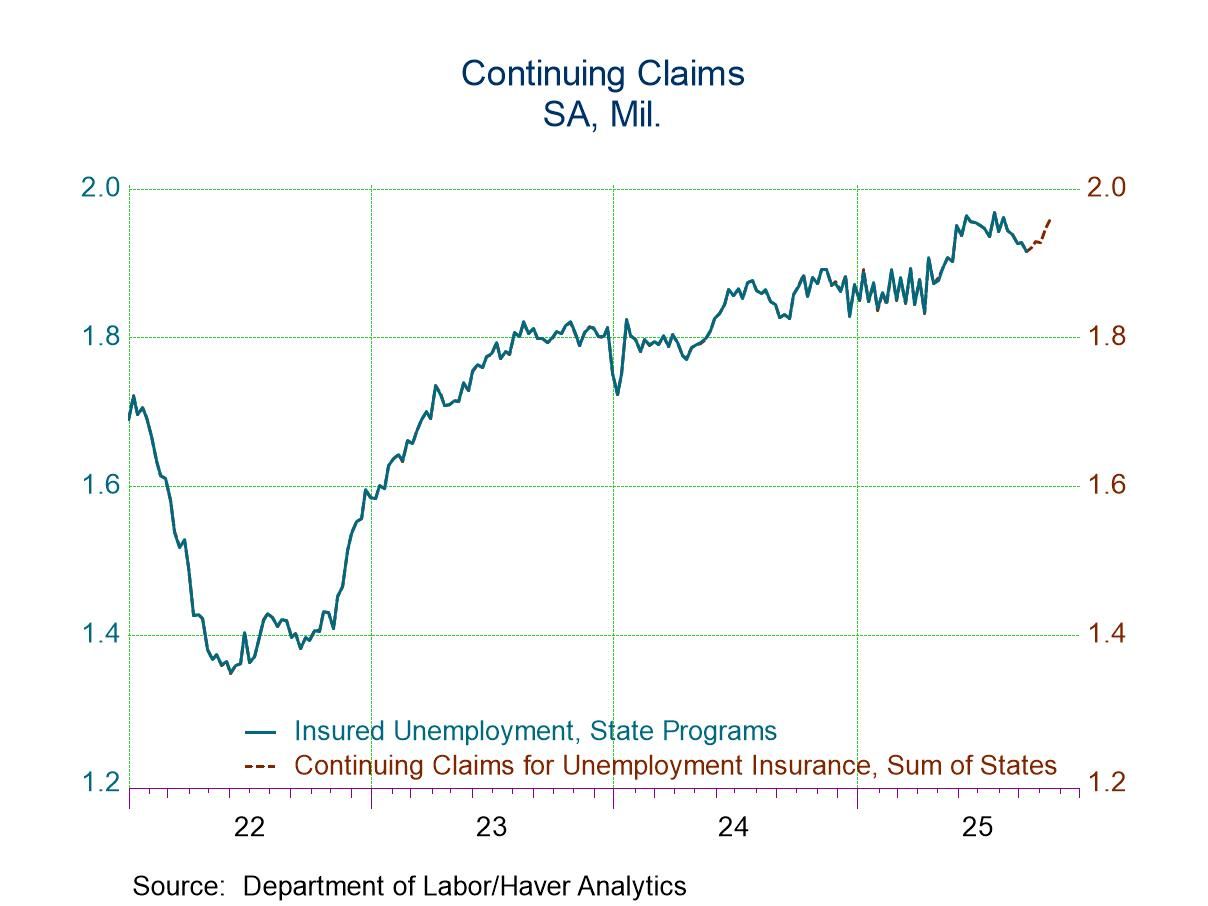 Continuing claims for unemployment insurance rose to 1.957 million (5.5% y/y) in the week ended October 18 from 1.947 million in the prior week. The four-week moving average rose to 1.940 million from 1.931 million. It was the highest level since the last week of August.