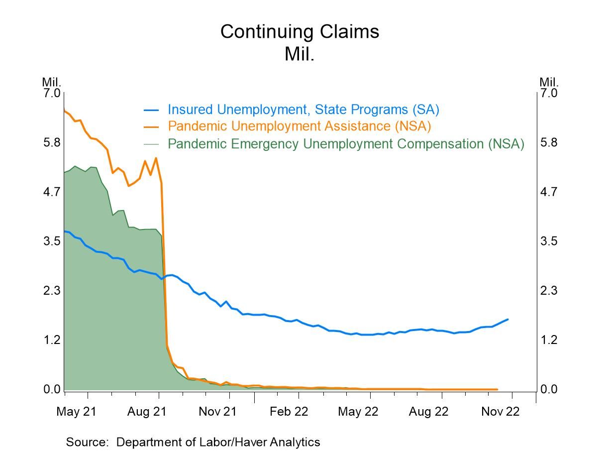 In the week ended November 19, the total number of continued weeks claimed in all unemployment insurance programs fell 6.1% (-34.1% y/y) to 1.284 million from 1.368 million in the prior week. This total includes federal employees, newly discharged veterans, extended benefits and other specialized programs and is not seasonally adjusted. Claims in the Pandemic Unemployment Assistance program and Pandemic Emergency Unemployment Compensation are no longer included in the main Labor Department press release, as both programs have expired.