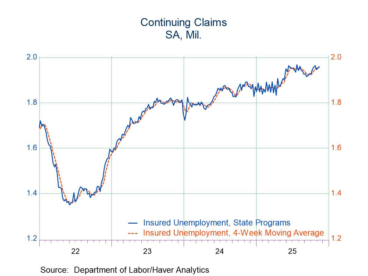 Continuing claims (previous claims filers who are still receiving unemployment benefits) continued to edge higher, rising to 1.960 million in the week of November 15 from a downwardly revised 1.953 million in the prior week (previously 1.974 million). While new claims have been well contained recently, continuing claims have risen persistently since midyear, indicating that while the pace of layoffs has not increased meaningfully, hiring has slowed. Consequently, those unemployed are having more difficulty finding new jobs and hence are receiving unemployment benefits for longer, a sign that labor market conditions are softening.