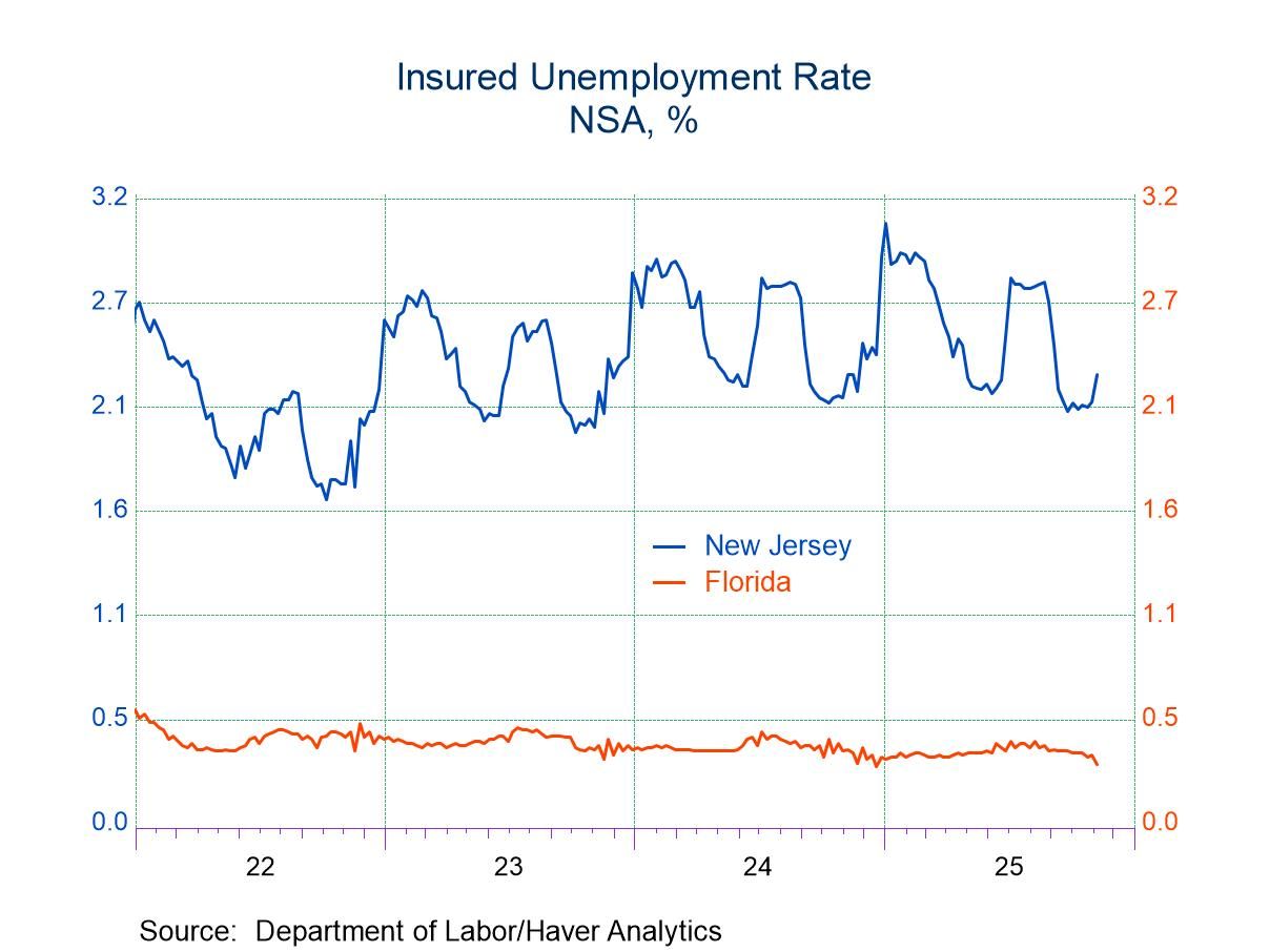 The insured unemployment rate varied greatly across individual states and territories. In the week ended November 8, the highest unemployment rates were in New Jersey (2.30%), Washington (2.20%), Massachusetts (1.90%), District of Columbia (1.90%), and California (1.80%). The lowest were in South Dakota (0.30%), Florida (0.30%), North Carolina (0.40%), and Louisiana (0.40%). Rates in other notable states include Pennsylvania (1.40%), Illinois (1.50%), New York (1.60%), Texas (1.10%), Michigan (1.40%) and Ohio (0.80%). These state data are not seasonally adjusted.