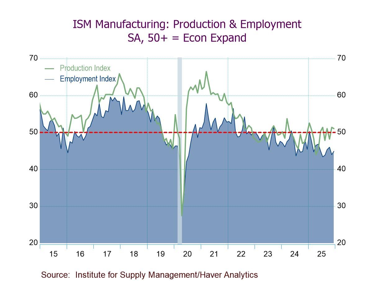 The production index eased to 51.0 in December after rising to 51.4 in November, suggesting production expanded for the third time in four months. The index was well above its recent low of 44.0 in April 2025 but below a high of 53.7 in March 2024. A lessened 19.0% (NSA) of respondents reported higher production in December while an increased 25.9% reported lower production.
