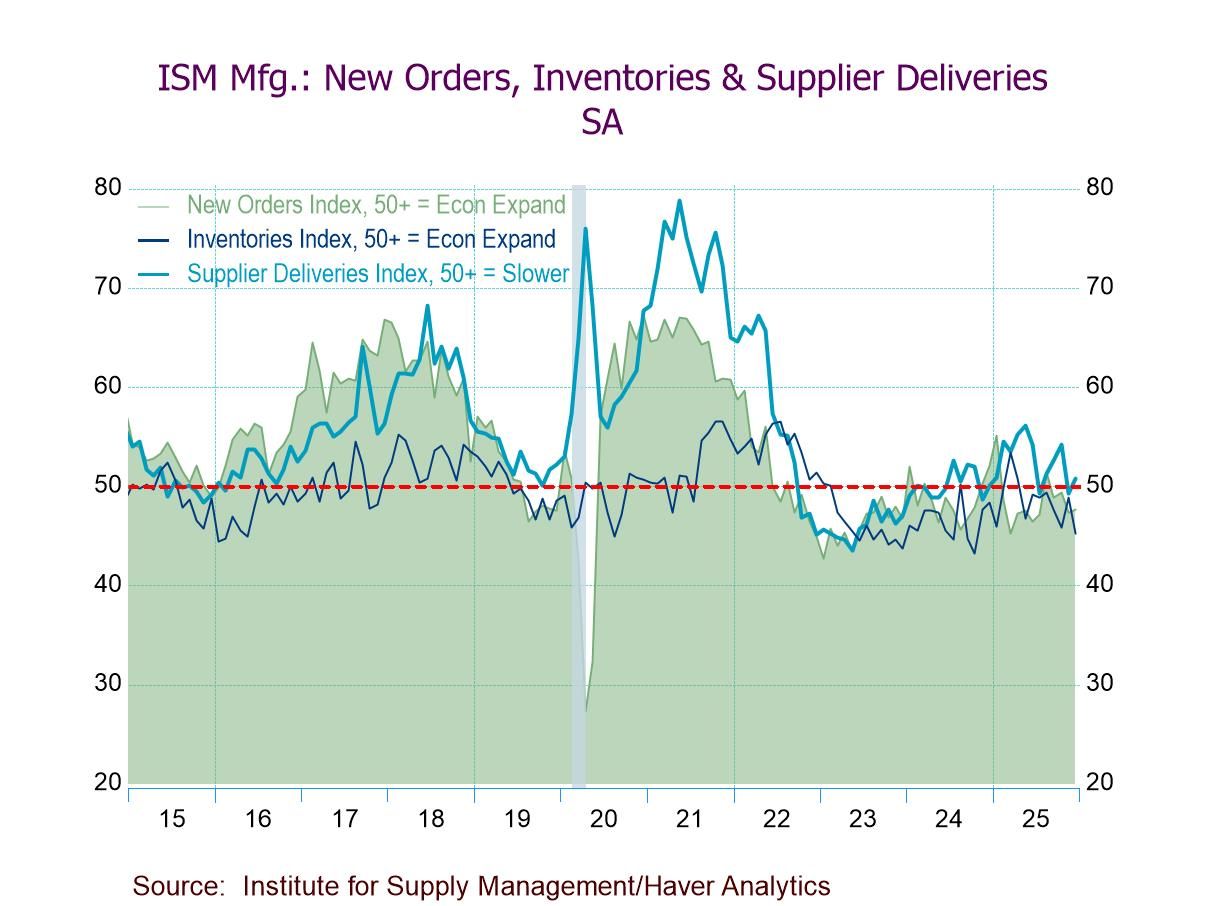 The new orders index rebounded to 47.7 in December from 47.4 in November, indicating new orders contracted for the fourth straight month. The index, while below its recent high of 55.1 in January 2025, remained above a low of 42.7 in January 2023. In December, 18.2% (NSA) of respondents reported higher new orders while an increased 31.5% reported declines. The inventories index fell to 45.2 in December after rising to 48.9 in November, marking the eighth consecutive month of contraction and the lowest level since October 2024. The index was down from its recent high of 53.4 in March 2025 and a high of 56.5 in July 2022. Meanwhile, the supplier deliveries index increased to 50.8 in December from 49.3 in November, indicating slower delivery performance after faster deliveries in November and three prior months in slower territory. In December, 10.4% (NSA) of respondents reported slower delivery speeds while 8.8% reported faster speeds.