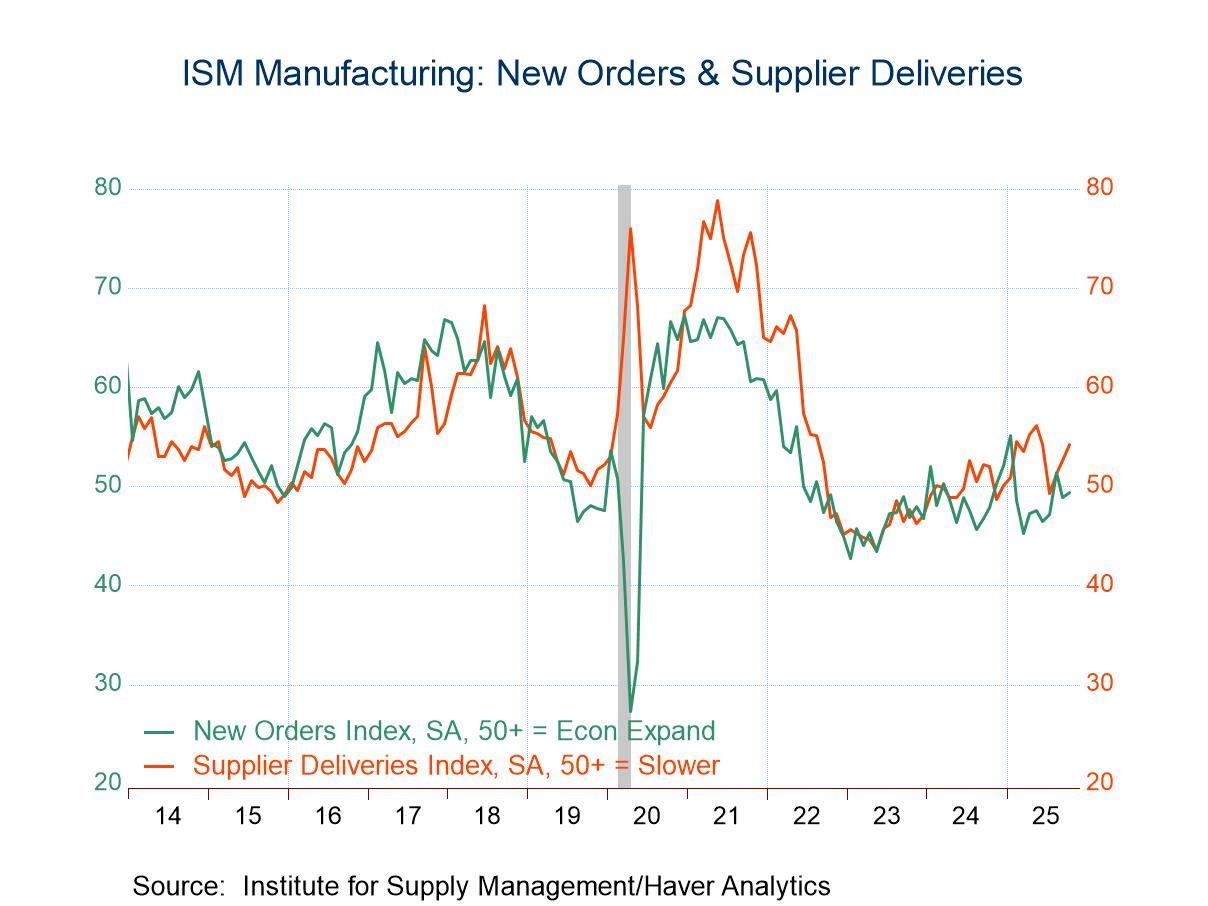 Working higher, the new orders index rose to 49.4 during October from 48.9 in September. An increased 20.4% (NSA) of respondents reported new orders improvement while 26.0% reported a decline. The employment index increased to a five-month high of 46.0 last month after rising to 45.3 in September. An increased 13.1% (NSA) of respondents more hiring while 22.3% reported less. The supplier delivery index rose to 54.2 in October from 52.6 in September. Twelve percent (NSA) of respondents reported slower product delivery speeds while 3.2% reported a quickening.