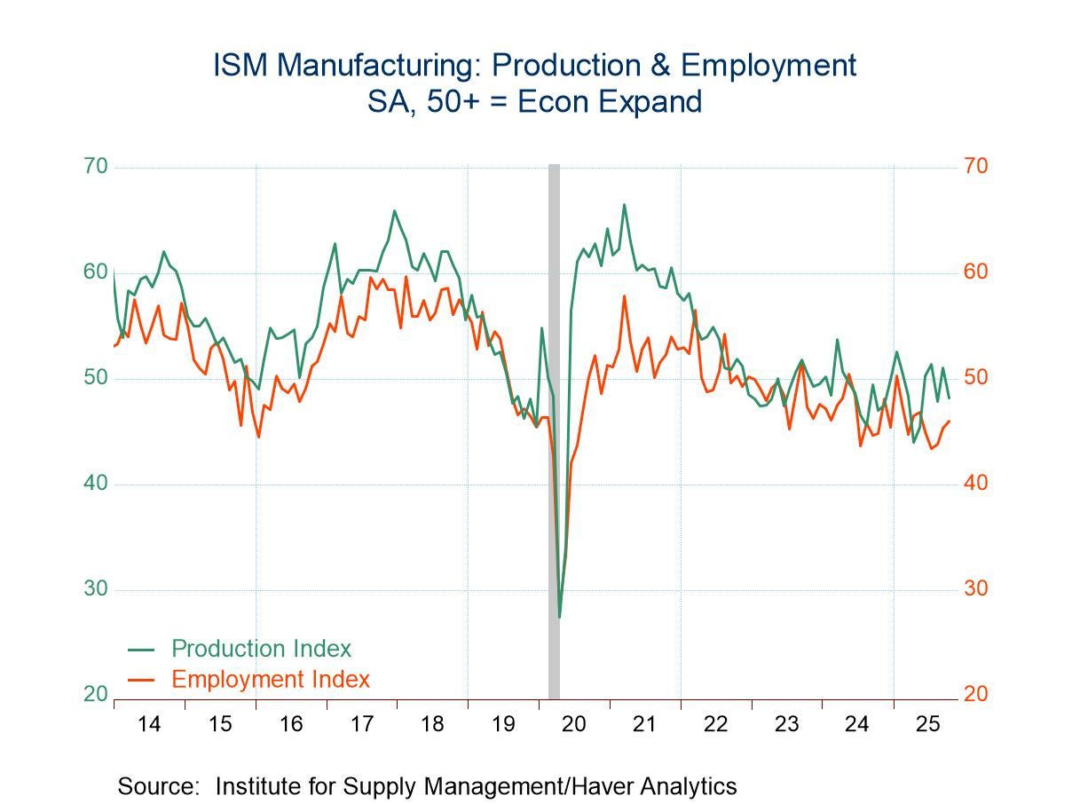 The production component declined to 48.2 last month after rising to 51.0 in September. It remained increased from an April low of 44.0. A lessened 27.3% (NSA) of respondents reported higher production while an increased 22.0% reported lower output levels. The inventory reading fell to a 12-month low of 45.8 from 47.7 in September. A lessened 13.2% (NSA) of respondents raised inventories while a higher 21.7% shed them.