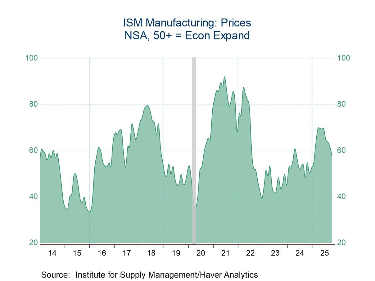 The prices index weakened to 58.0 (NSA) during October from 61.9 in September. It was below a high of 69.8 in April, and well above its low of 39.4 in December 2022. A lessened 27.3% of respondents reported higher prices, a nine month low, while an increased 8.7% reported lower.