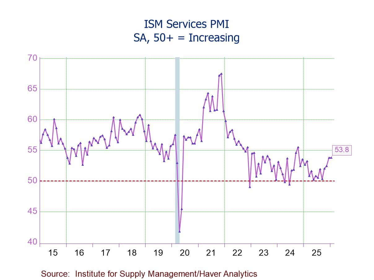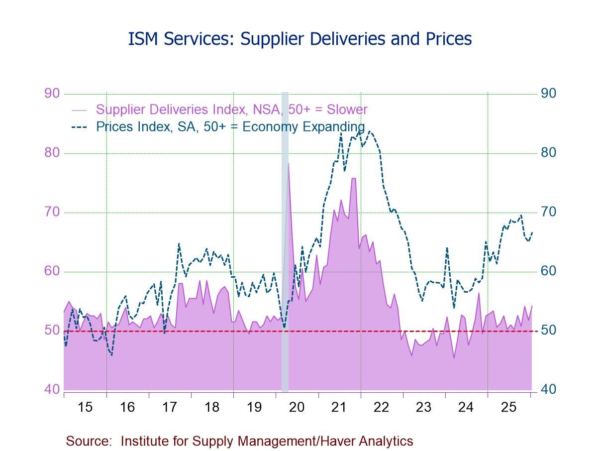 The ISM Services PMI is a composite index consisting of four equally weighted diffusion indexes: Business Activity, New Orders, Employment, and Supplier Deliveries. A reading above 50 indicates expansion in the services sector; below 50 suggests contraction. Supplier Deliveries is the only ISM index that is inversed; a reading above 50 indicates slower deliveries. The ISM figures are available in Haver's USECON database, with additional detail in the SURVEYS database. The expectations figure from Action Economics is in the AS1REPNA database.