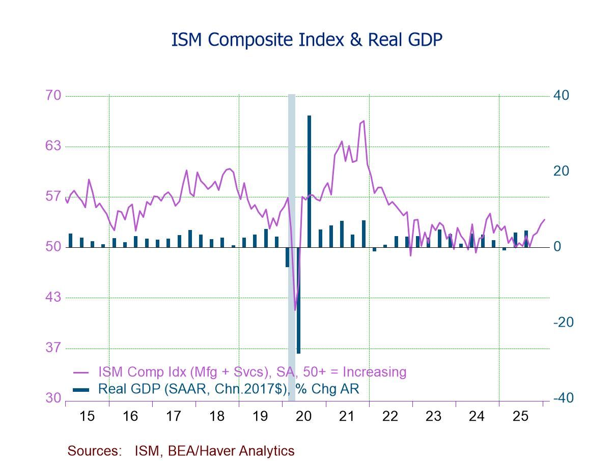 Haver Analytics constructs a composite index combining the services index and the manufacturing reading. This index rose to 53.7 in January from 53.1 in December and 51.9 in November, signaling expansion for the eighth straight month and at the fastest pace since October 2024. The latest figure was above a low of 49.3 in June 2024 and a low of 48.9 in December 2022 but below 52.3 in January 2025 and a record-high 66.7 in November 2021. These series date back to July 1997.