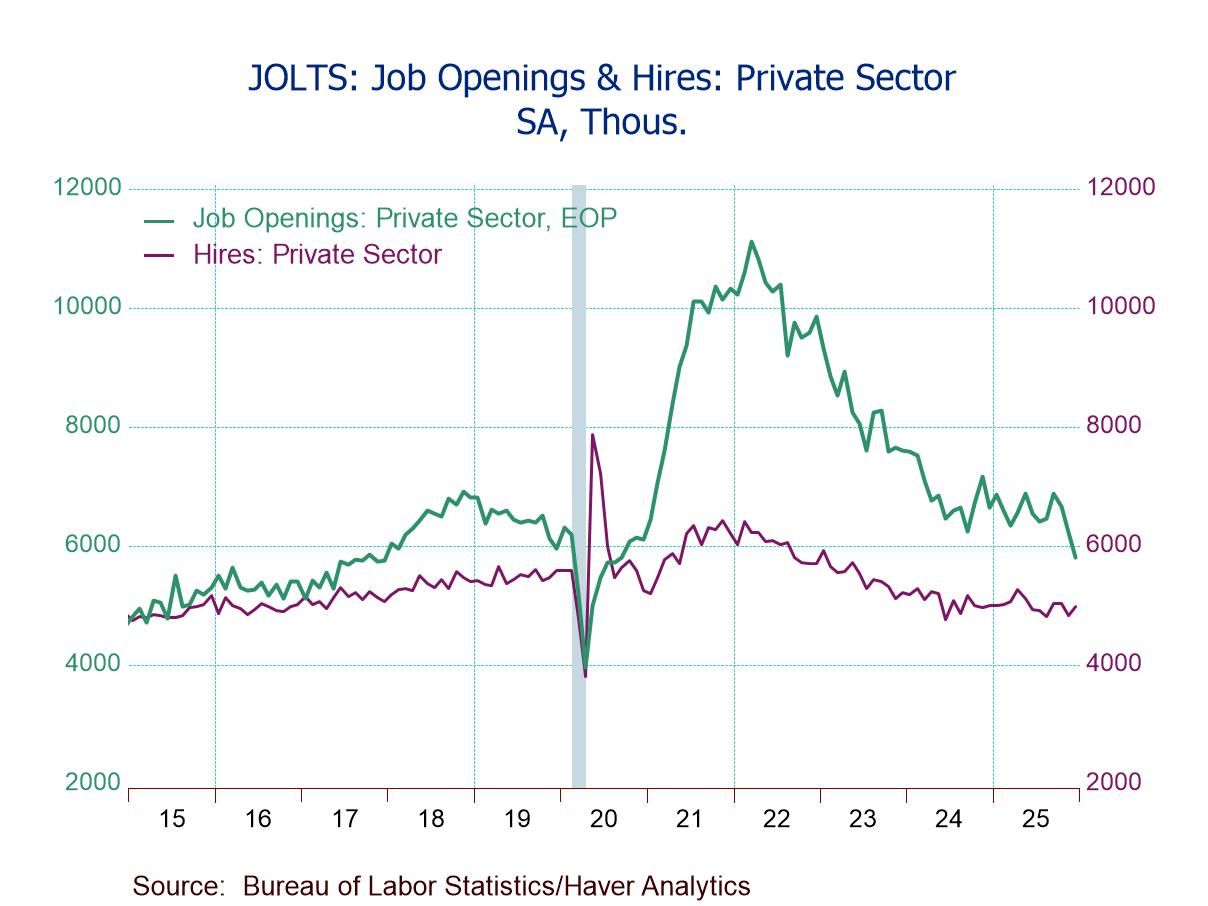 Total job openings fell 5.6% m/m (-12.9% y/y) to 6.542 million in December after a downwardly revised 7.0% decline to 6.928 million in November (previously -4.1% m/m; 7.146 million), according to the Job Openings and Labor Turnover Survey. December marked the third consecutive m/m fall and the lowest level since September 2020. The job openings rate declined to 3.9% in December, the lowest since April 2020, from 4.2% in November, remaining below a record-high 7.4% in March 2022. This rate is calculated as the ratio of job openings to total nonfarm employment plus openings. Significantly, the drop in job openings also lowered the ratio of job openings to unemployed individuals to 0.872 in December—the lowest since March 2021—from 0.890 in November, down from 1.085 in December 2024 and a pre-pandemic 1.211 in February 2020. A reading of 0.872 implies there were about 0.87 open jobs per unemployed person—indicating fewer openings than unemployed workers. December was the fifth time in six months that this ratio remained below 1.0.