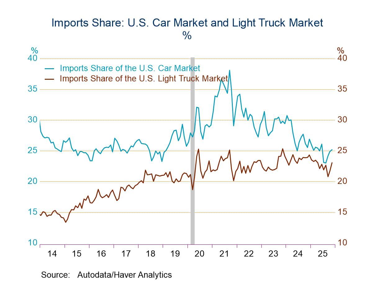 Imports' 23.5% share during November of the U.S. light vehicle market rose from 22.2% in October. These compared to a high of 26.3% in November of 2023. Imports' share of the passenger car market edged up to 25.2% last month from 25.0% in October. It reached a high of 38.1% in September 2021. Imports' share of the light truck market increased to 23.1% last month from 21.7% in October.