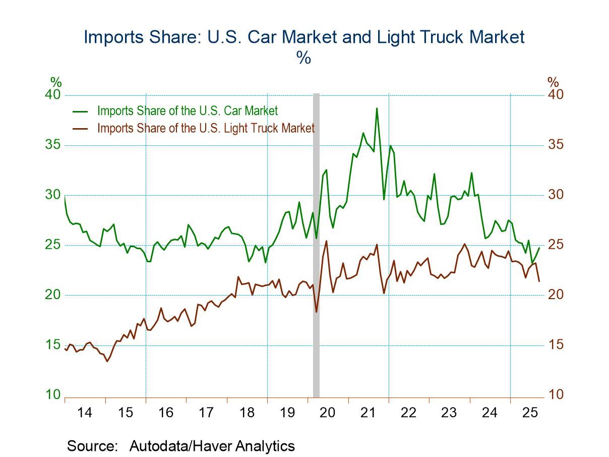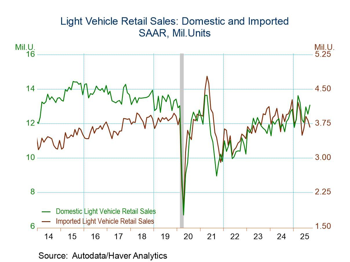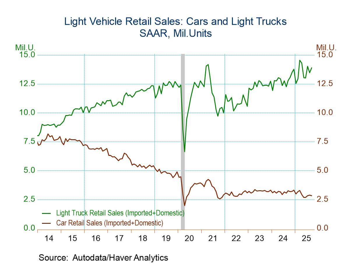 Sales remained uneven last month. Light truck sales rose 3.0% (8.6% y/y) in September to 13.89 million units, after falling 3.9% in August. Purchases of domestically-made light trucks rose 5.6% (12.2% y/y) to 10.92 million units, after falling 4.2% in August. Sales of imported light trucks fell 5.1% (-2.9% y/y) to 2.97 million units, following a 3.4% August decline.