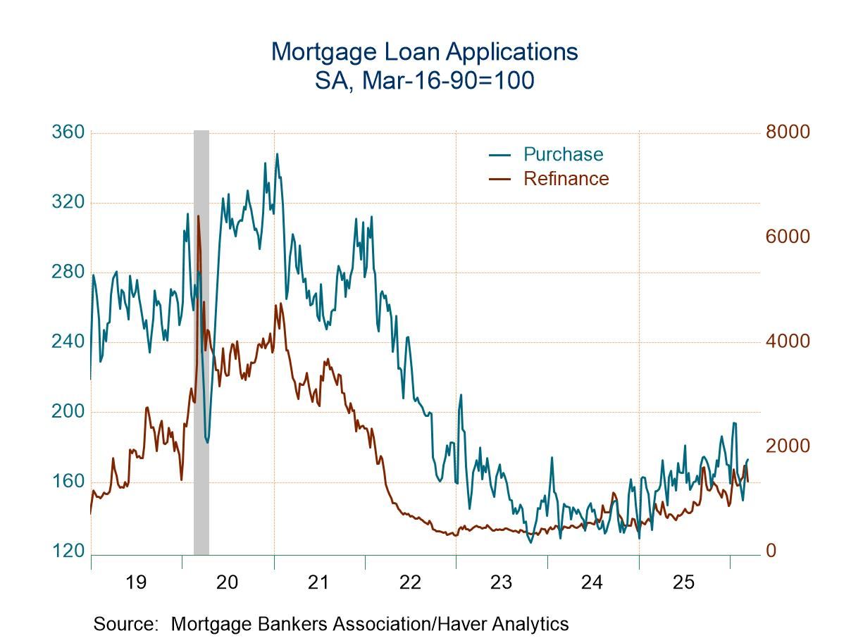 The Mortgage Bankers Association Survey covers 75% of all U.S. retail residential mortgage applications and has been conducted weekly since 1990. Respondents include mortgage bankers, commercial banks and thrifts. The base period and value for all indexes is March 16, 1990=100. The figures for weekly mortgage applications and interest rates are available in Haver’s SURVEYS database.