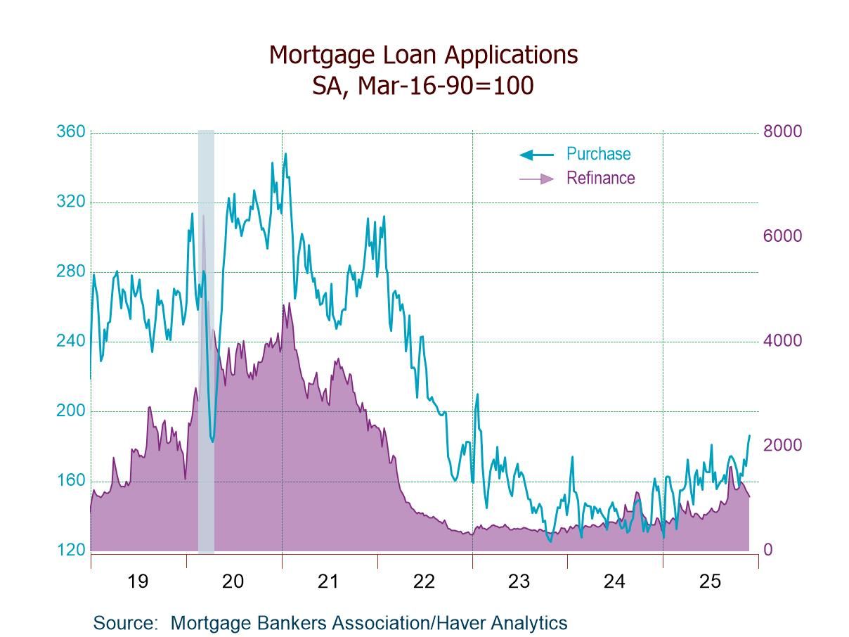 The Mortgage Bankers Association Survey covers 75% of all U.S. retail residential mortgage applications and has been conducted weekly since 1990. Respondents include mortgage bankers, commercial banks and thrifts. The base period and value for all indexes is March 16, 1990=100. The figures for weekly mortgage applications and interest rates are available in Haver’s SURVEYS database.