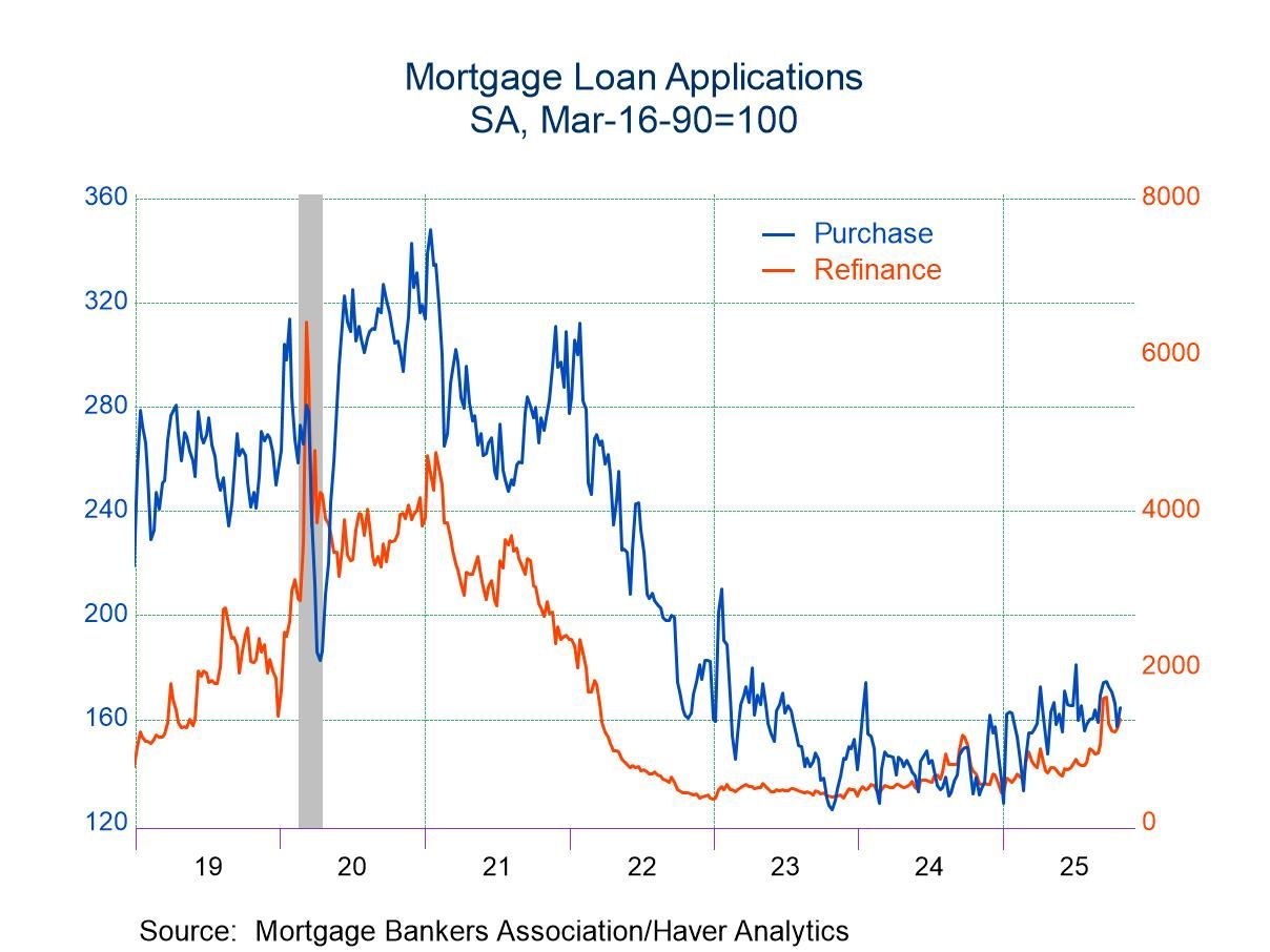 The Mortgage Bankers Association Survey covers 75% of all U.S. retail residential mortgage applications and has been conducted weekly since 1990. Respondents include mortgage bankers, commercial banks and thrifts. The base period and value for all indexes is March 16, 1990=100. The figures for weekly mortgage applications and interest rates are available in Haver’s SURVEYS database.