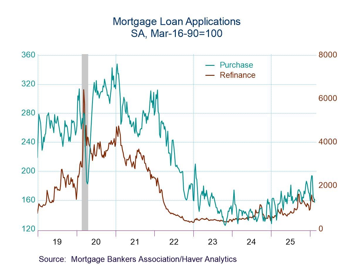The Mortgage Bankers Association Survey covers 75% of all U.S. retail residential mortgage applications and has been conducted weekly since 1990. Respondents include mortgage bankers, commercial banks and thrifts. The base period and value for all indexes is March 16, 1990=100. The figures for weekly mortgage applications and interest rates are available in Haver’s SURVEYS database.