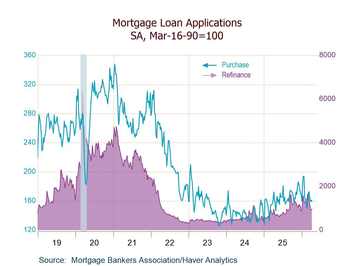 The Mortgage Bankers Association Survey covers 75% of all U.S. retail residential mortgage applications and has been conducted weekly since 1990. Respondents include mortgage bankers, commercial banks and thrifts. The base period and value for all indexes is March 16, 1990=100. The figures for weekly mortgage applications and interest rates are available in Haver’s SURVEYS database.