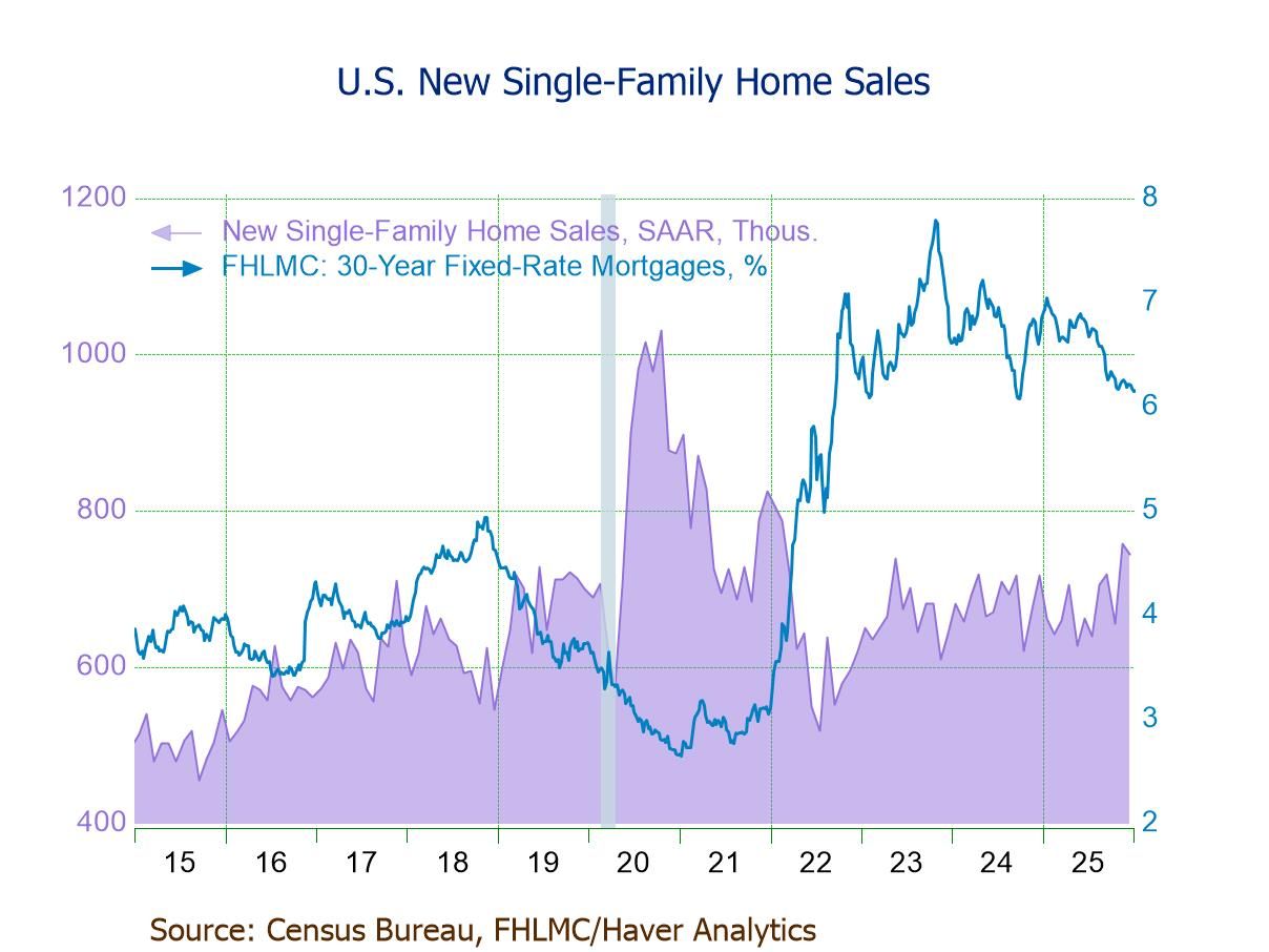 New single-family home sales fell 1.7% m/m (+3.8% y/y) to a seasonally adjusted annual rate of 745,000 units in December—above expectations—following a 15.5% jump to 758,000 in November and a downwardly revised 8.8% drop to 656,000 in October (previously -0.1%, 737,000), data from the U.S. Census Bureau showed. The Action Economics Forecast Survey had expected sales of 733,000 for December. The December figure was the second m/m decline in three months, though sales remained 43.5% above the July 2022 low of 519,000. For all of 2025, new home sales declined 0.5% after gains of 3.0% in 2024 and 4.4% in 2023. The December m/m sales fall occurred alongside a decrease in the average 30-year fixed mortgage rate to 6.20%, the lowest since September 2024, down from 6.24% in November and 6.72% in December 2024; the rate had subsequently continued trending downward, according to Freddie Mac.
