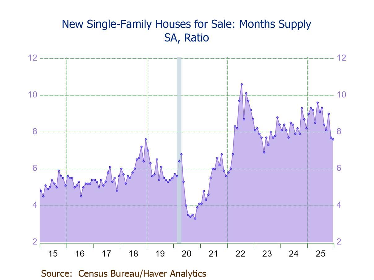 The number of unsold new homes on the market fell 2.7% (-3.5% y/y) to 472,000 in December after a 1.0% decline to 485,000 in November, representing the sixth m/m fall in seven months and the lowest level since August 2024. The latest figure was 10.8% above a low of 426,000 in July 2023. The seasonally adjusted months' supply of new homes for sale dipped to 7.6 months in December—the lowest reading since July 2023—after falling to 7.7 months in November. The latest reading, while above a low of 6.9 months in May 2023, remained below a high of 10.6 months in July 2022.