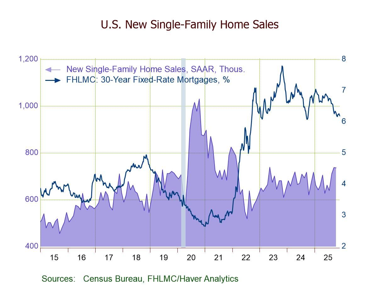 New single-family home sales dipped 0.1% m/m (+18.7% y/y) to a seasonally adjusted annual rate of 737,000 units in October following rises of 3.8% to 738,000 in September and 11.3% to 711,000 in August (+20.5%, 800,000 previously), data from the U.S. Census Bureau showed. The Action Economics Forecast Survey had expected sales of 710,000 for October. The October figure was the first m/m decline since July, though sales remained 42.0% up from the July 2022 low of 519,000. The sales dip occurred alongside a drop in the average 30-year fixed mortgage rate to 6.25% in October, the lowest since September 2024, after declining to 6.35% in September; it had subsequently continued trending downward, according to Freddie Mac.