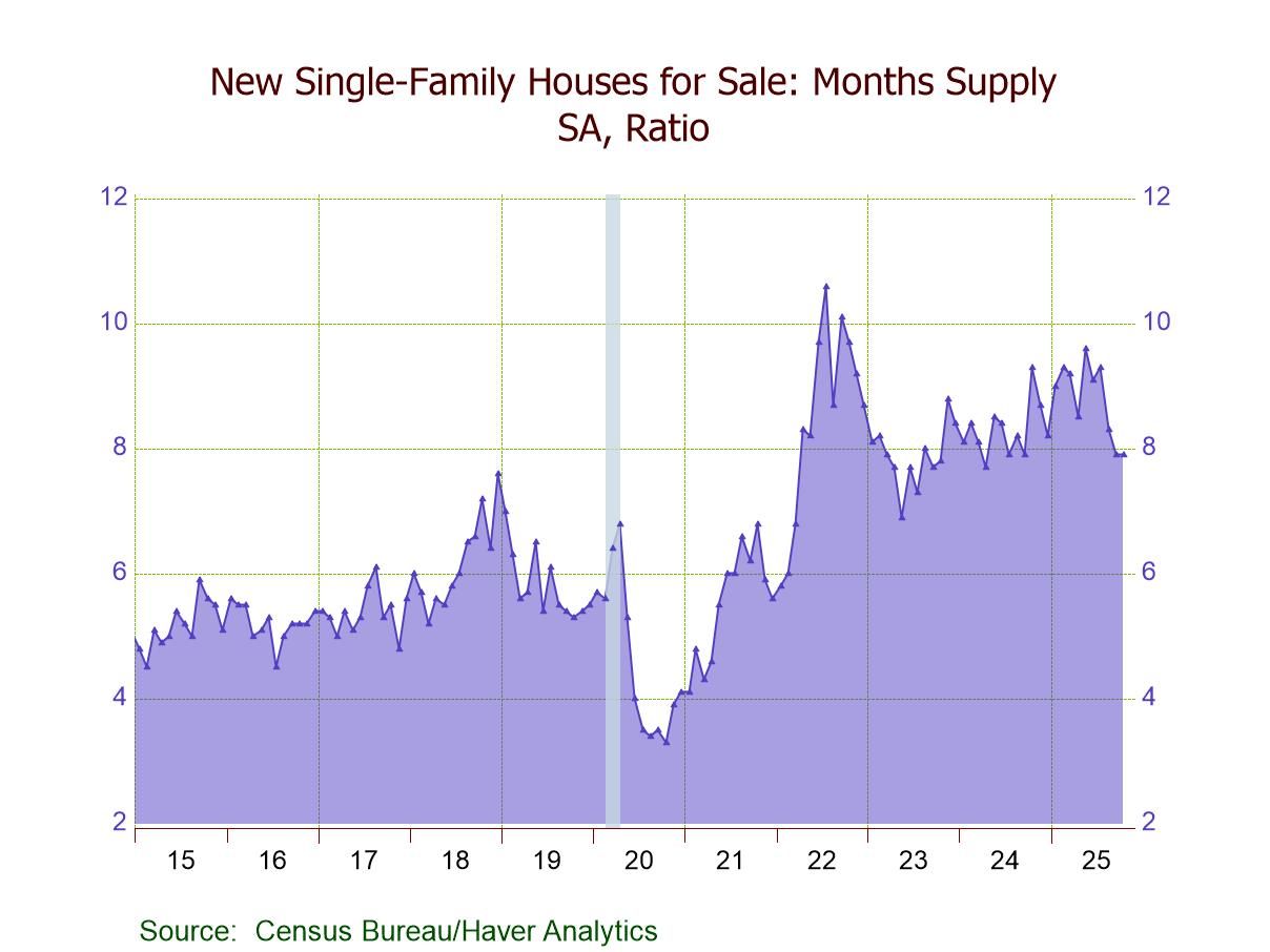 The number of unsold new homes on the market held steady at 488,000 (+1.7% y/y) in October after four straight m/m declines. The latest figure was 14.6% above a low of 426,000 in July 2023. The seasonally adjusted months' supply of new homes for sale remained at 7.9 months in October and September—the lowest reading since September 2024—after falling to 8.3 months in August. The latest reading, while above a low of 6.9 months in May 2023, remained below a high of 10.6 months in July 2022.