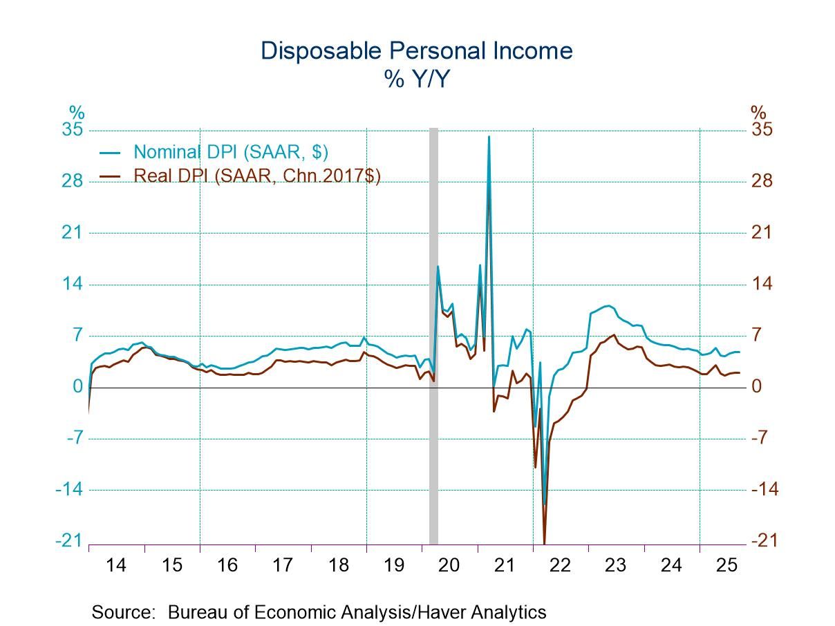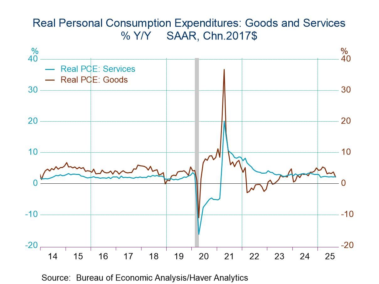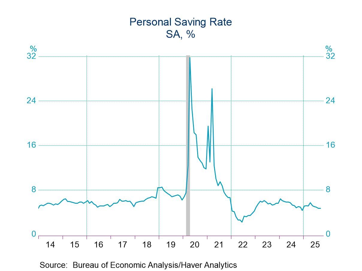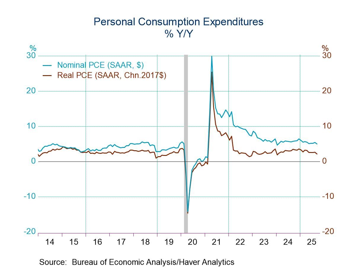 Personal consumption expenditures in September improved 0.3% (5.0% y/y) after increasing 0.5% for three consecutive months. A 0.4% rise had been expected in the Action Economics Forecast Survey. After adjusting for inflation, PCE held steady, the weakest increase in four months. Real PCE growth of 2.1% y/y compared to a 3.6% rise during 2024.