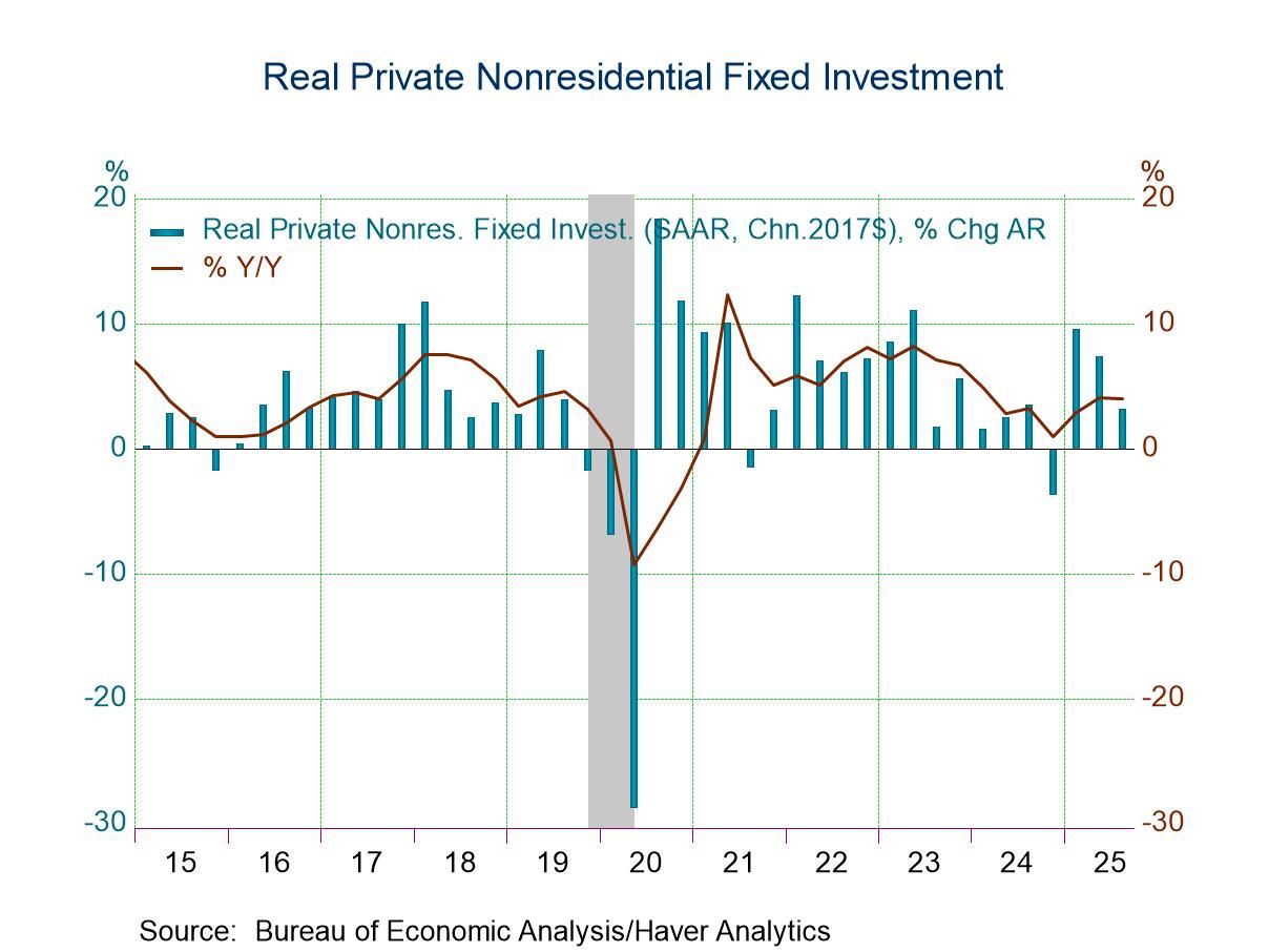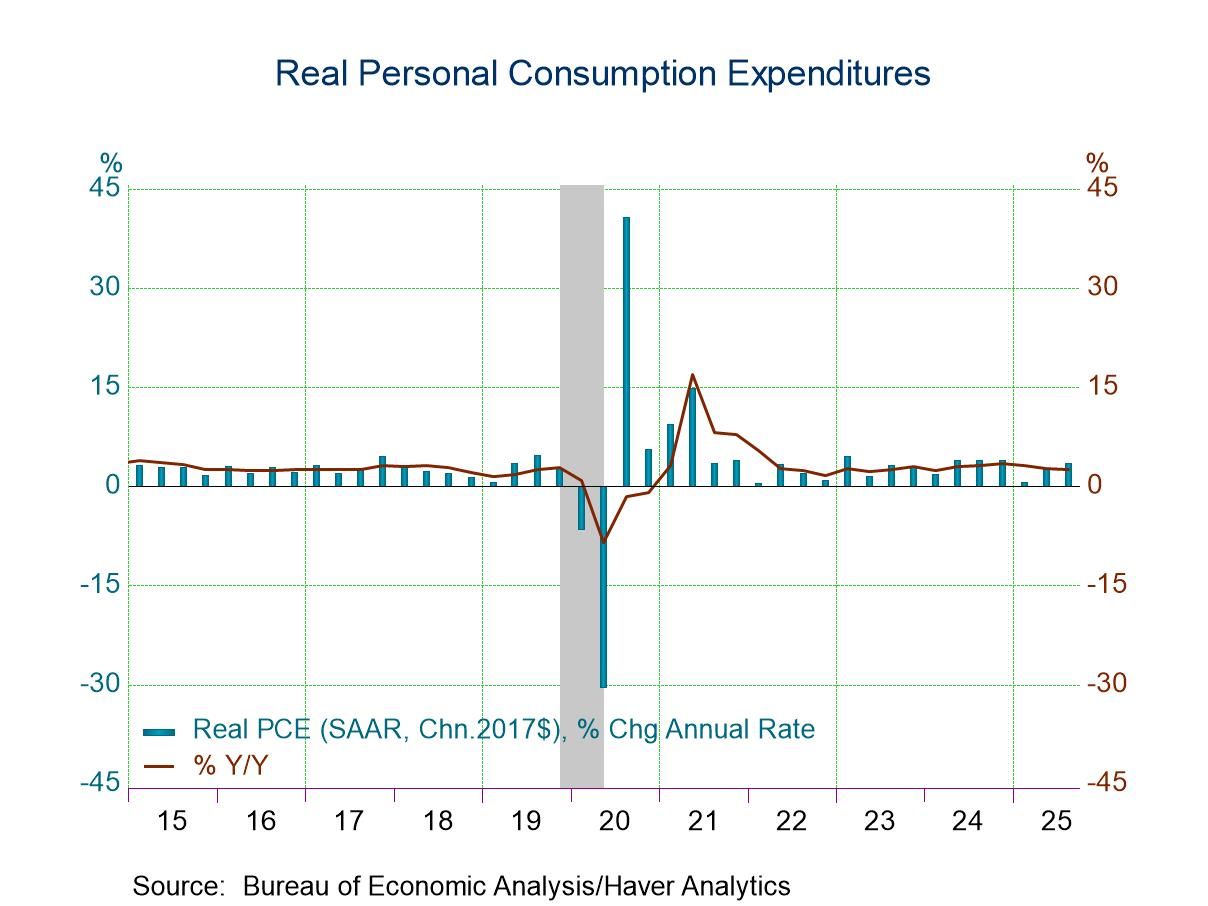 The primary driver of overall growth continued to be personal consumption expenditures. They increased an unrevised 3.5% q/q saar in Q3, adding 2.34%-points to total GDP growth. This reflected a 3.0% increase in spending on goods versus 3.1% previously and a 3.6% gain in spending on services versus 3.7% previously. The rise in government spending was unrevised at 2.2% q/q. However, spending by the federal government was revised slightly slower to 2.7% from 2.9% while spending by state and local governments was revised up slightly to 2.0% from 1.8%.