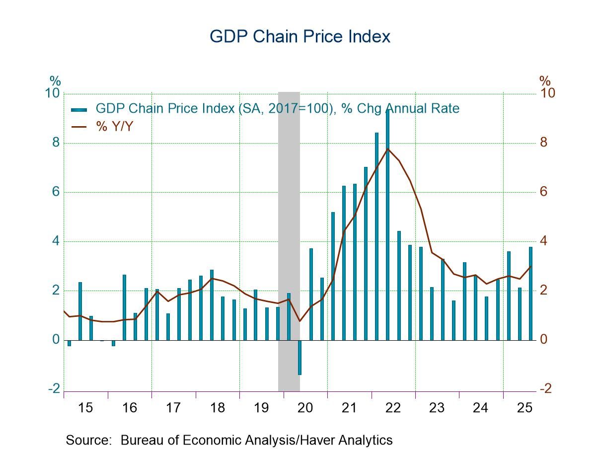 Key measures of inflation were unrevised. Inflation as measured by the GDP price index remained at 3.8% q/q saar in Q3, but this was up markedly from 2.1% in Q2. Similarly, PCE inflation in Q3 was unrevised at 2.8% versus 2.1% in Q2. Core PCE inflation was also unrevised at 2.9% in Q3.