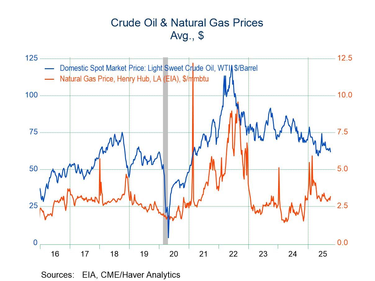 The price of West Texas Intermediate crude oil fell to $61.79 per barrel (-13.5% y/y) in the week ended October 3 after rising in the prior week to $64.35 per barrel. Prices remained below a recent high of $74.17 during the third week of June. The cost of crude oil peaked at $120.46 in the week of June 10, 2022. Yesterday, the price was $61.69 per barrel. The price of European Brent crude fell to $67.15 per barrel (-11.5% y/y) in the week of October 3 from $69.22 in the prior week. Prices remained below a recent high of $95.61 in the week of September 29, 2023 and below a peak of $127.40 in June 2022. Yesterday, the price was $67.09 per barrel.