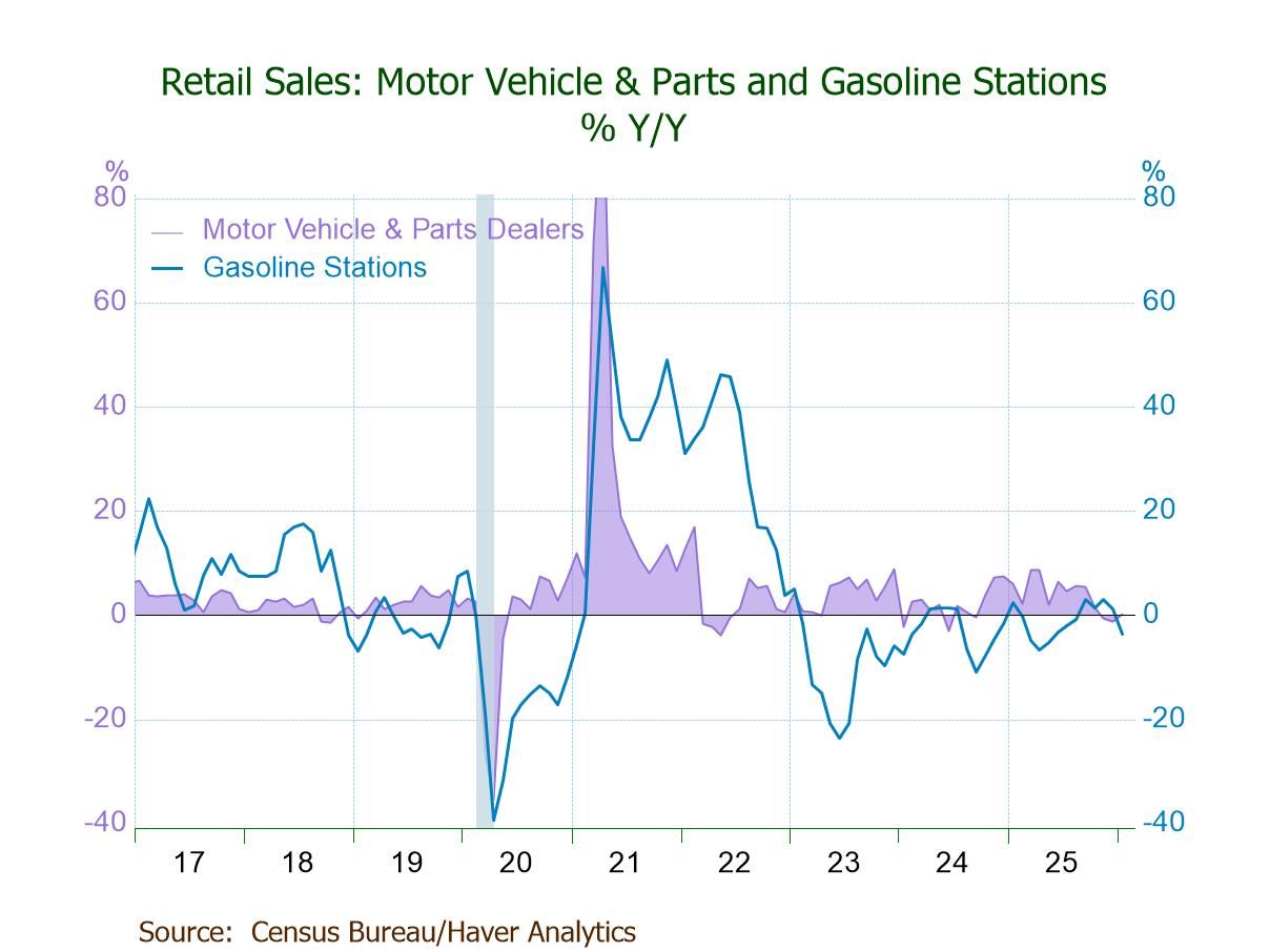 - Declines m/m: gasoline stations (-2.9%), clothing stores (-1.7%), sporting goods (-1.2%), electronics stores (-0.6%).
