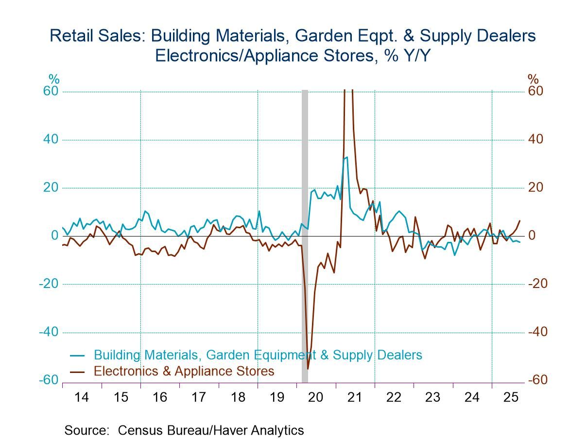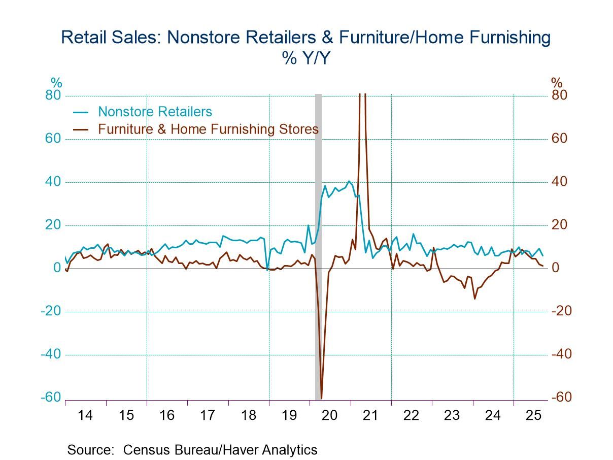 Elsewhere, sales were lackluster in September. Nonstore retail sales declined 0.7% (+6.0% y/y) after increasing 1.6% in August. Clothing store sales were off 0.7% (+6.7% y/y) following a 1.0% increase. Sporting goods & hobby shop sales declined 2.5% (-0.2% y/y) after strengthening 1.0%. Sales at electronics & appliance stores weakened 0.5% (+6.3% y/y) after easing 0.3% in August. General merchandise store sales improved 0.1% (1.6% y/y) as they did in July, while department store sales weakened 0.7% (-3.3% y/y) after falling 0.9%. Furniture & home furnishings store sales rose 0.6% (1.2% y/y) in September following a 2.0% decline. Miscellaneous store sales rose 2.9% (8.2% y/y) and reversed a 2.9% decline in August.