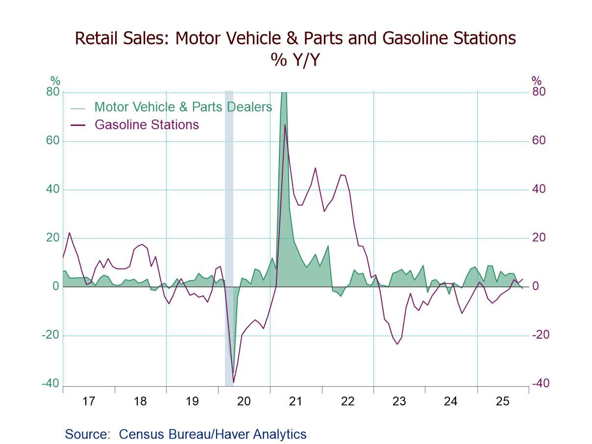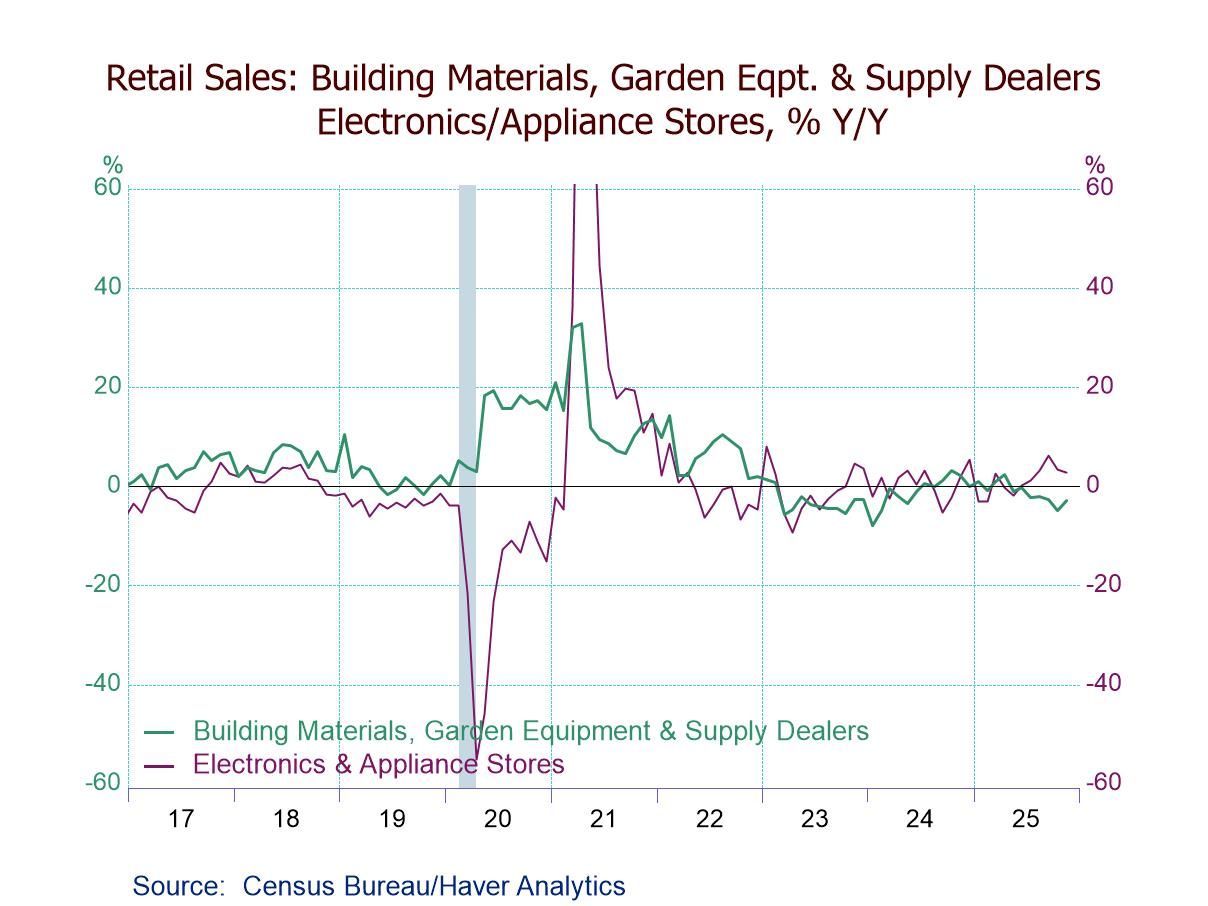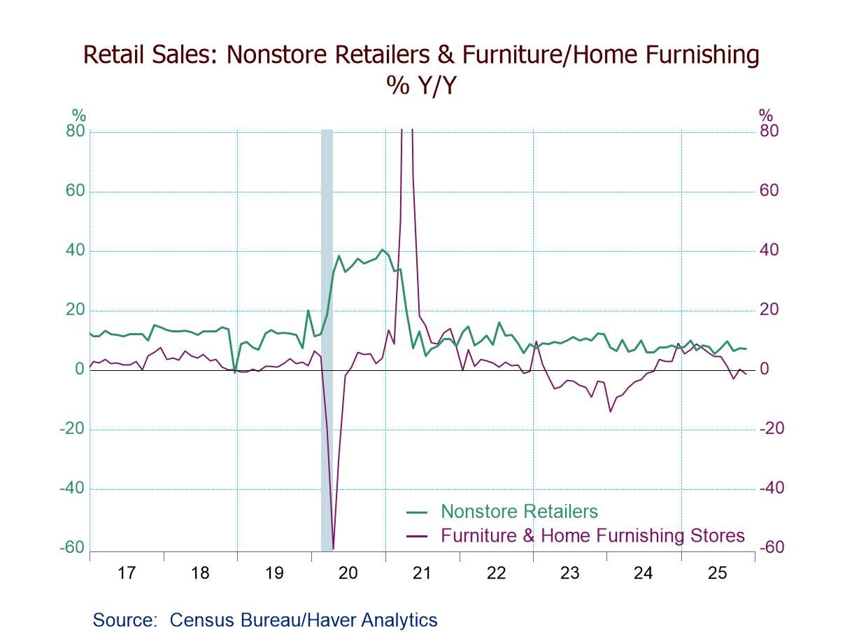 - Gains m/m: sporting goods (+1.9%), misc. stores (+1.7%), gasoline stations (+1.4%), and bldg. materials (+1.3%).