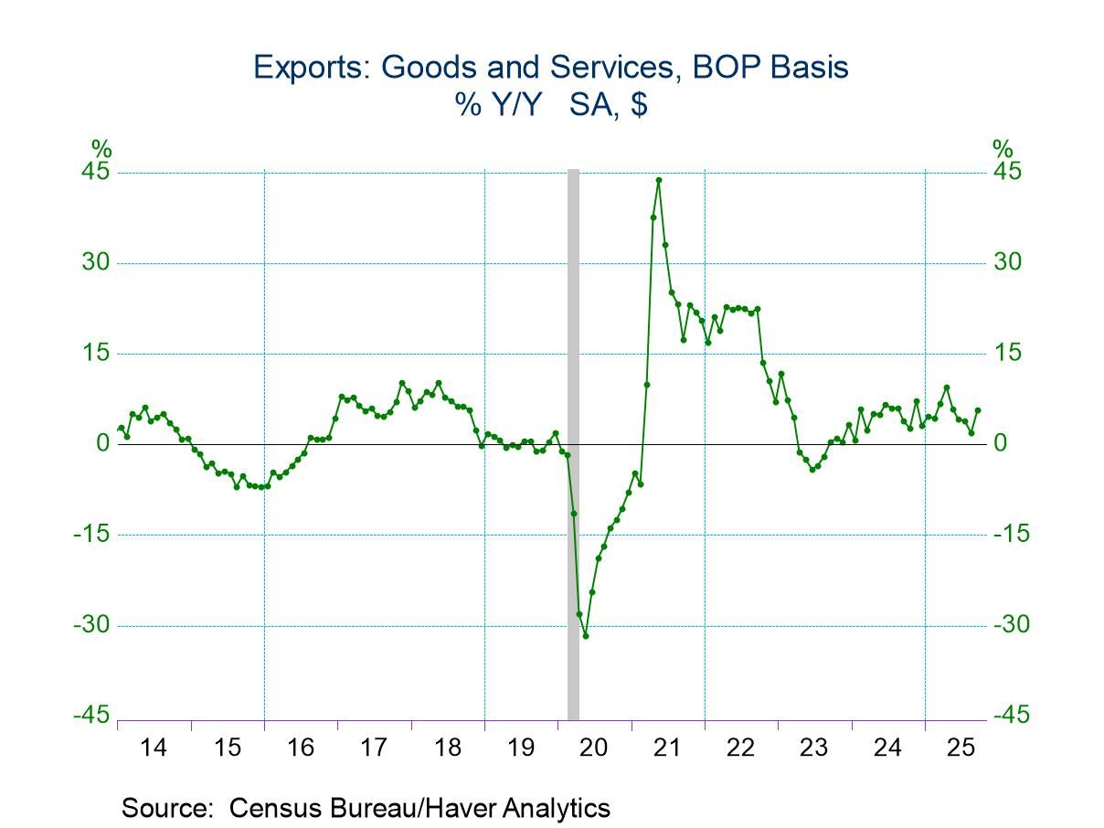 Exports of goods & services rose 3.0% (5.7% y/y) in September following a 0.2% August slip. Goods exports (Census basis) strengthened 4.9% after a 0.8% slip. Nonauto consumer goods exports surged 19.1%. Industrial supplies & materials exports increased 12.1% while foods, feeds & beverage exports rose 3.4%. “Other” goods exports rose 7.6%. To the downside, capital goods exports excluding autos declined 5.3% while auto & parts exports fell 2.2%. Services exports eased 0.4%. Exports of financial services rose 1.4% while exports of maintenance & service repairs rose 0.8%. Exports of government goods and services rose 1.7%.