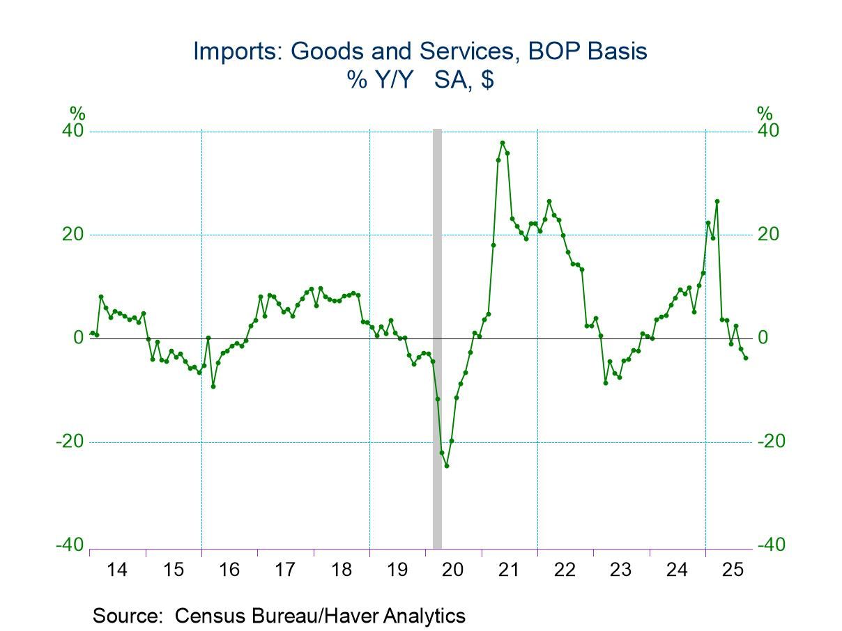 Imports of goods & services in September increased 0.6% (-3.7% y/y) after a 5.2% decline. Goods imports rose 0.7% (-5.9% y/y) in September after a 6.6% August decline. Nonauto consumer goods jumped 18.4% while industrial supplies & materials imports were little-changed. Elsewhere, imports fell. Capital goods excluding auto imports slumped 6.0%, auto imports fell 4.1% and food imports declined 1.6%. Total services imports rose 0.3% in September after a 0.3% decline. Maintenance & repair services increased 3.1%, construction service imports rose 1.1%, transport rose 1.5% but travel weakened 1.2%. Imports of government goods & services held steady.