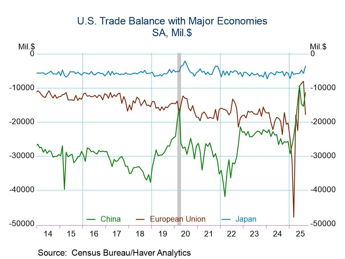 By country, the goods trade deficit with China narrowed to $11.4 billion (SA) in September from $15.4 billion in August. Exports to China rose 1.8% while imports from China weakened 16.1%. The trade deficit with the European Union doubled m/m to $17.8 billion in September. Exports rose 13.2% but imports surged by one-third. The deficit with Japan declined sharply to $3.6 billion in September. Exports increased 7.9% while imports declined 12.7%.