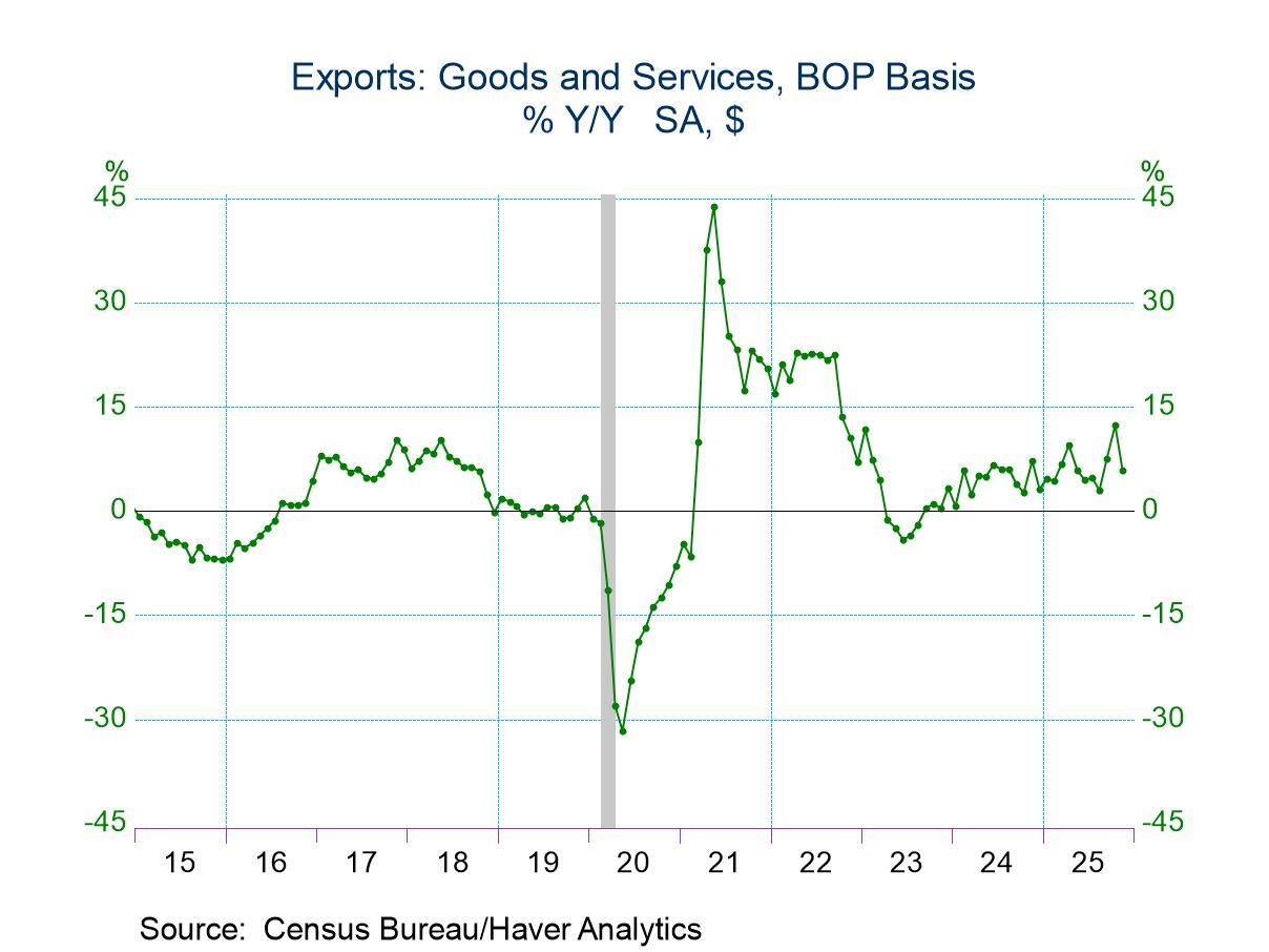 Exports of goods and services fell 3.6% m/m (+5.9% y/y) in November, more than reversing a 3.0% m/m gain in October. This was the first monthly decline in six months. Goods exports (Census basis) plunged 5.7% m/m in November after monthly increases of 4.3% in October and 5.6% in September. The November weakness was widespread. “Other” exports slumped 13.5% m/m; exports of consumer goods ex autos fell 12.9% m/m; industrial supplies exports declined 7.9% m/m (with nonmonetary gold exports falling $4.2 billion); auto exports slumped 5.8% m/m; food exports decreased 4.0% m/m. A 1.2% monthly gain in capital goods exports was the only major end-use category to report an increase in November. Services exports edged up 0.2% m/m with travel rising 1.4% m/m.
