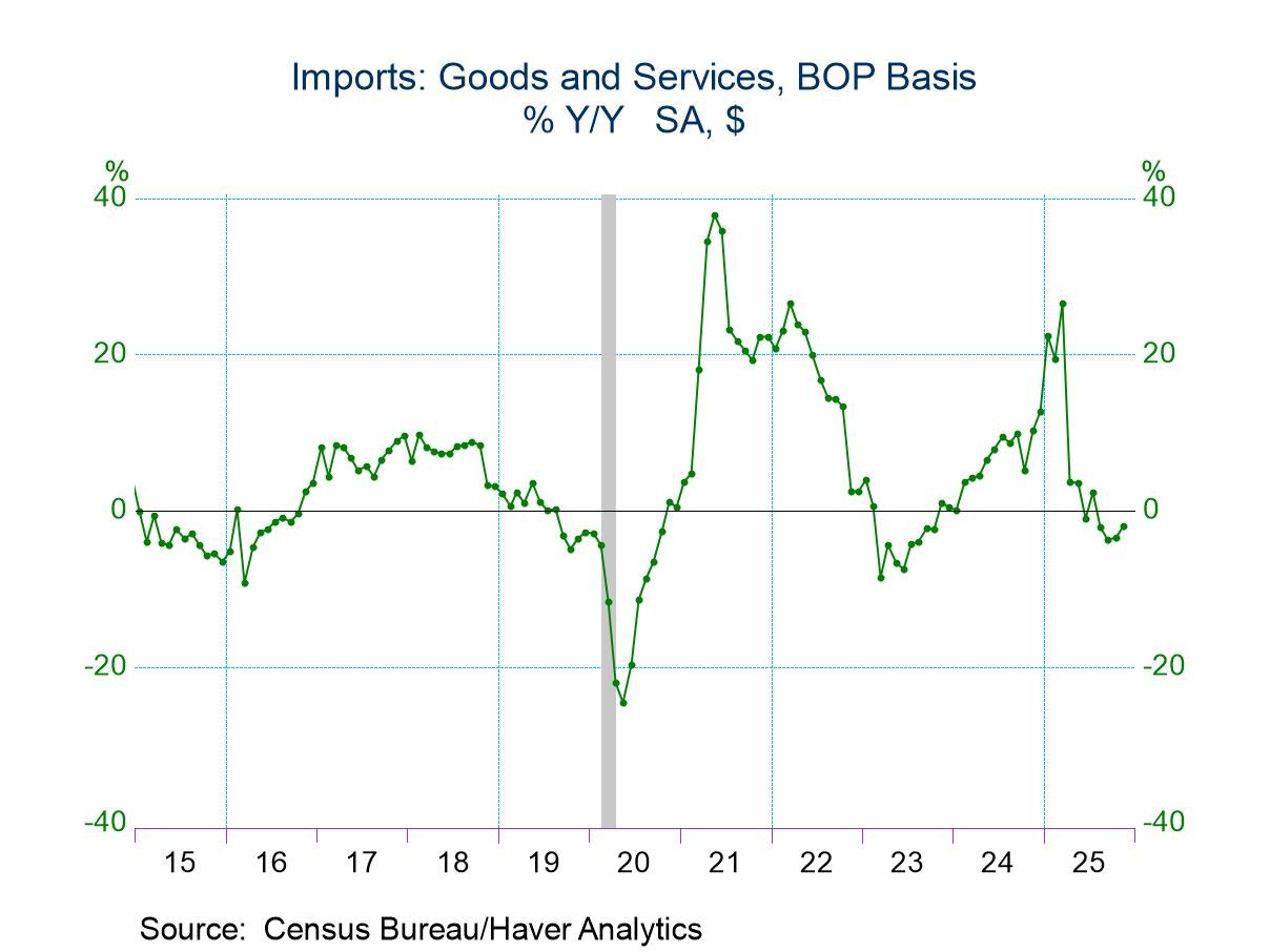 Imports of goods and services rebounded 5.0% m/m (-1.9% y/y) in November, more than reversing their 3.0% monthly decline in October. Goods imports (Census basis) surged 6.5% m/m after tumbling 4.1% m/m in October. Imports of non-auto consumer goods jumped 17.6% m/m but failed to reverse the 20.4% plummet in October. Imports of “other goods” soared 16.1% m/m, its largest monthly gain since July 2020. Capital goods imports rose a solid 7.9% m/m on top of a 7.8% monthly gain in October. Food imports gained 3.8% m/m, their first monthly gain in four months. By contrast, imports of industrial supplies fell 5.0% m/m, their third monthly decline in the past four months. Auto imports edged down 0.6% m/m, their third consecutive monthly decline. Service imports slipped 0.1% m/m in November, their first monthly decline in three months. Travel imports fell 1.4% m/m; charges for imported intellectual property decline 1.3% m/m; imported maintenance and repair services fell 3.6% m/m, their first monthly decline since March 2025.