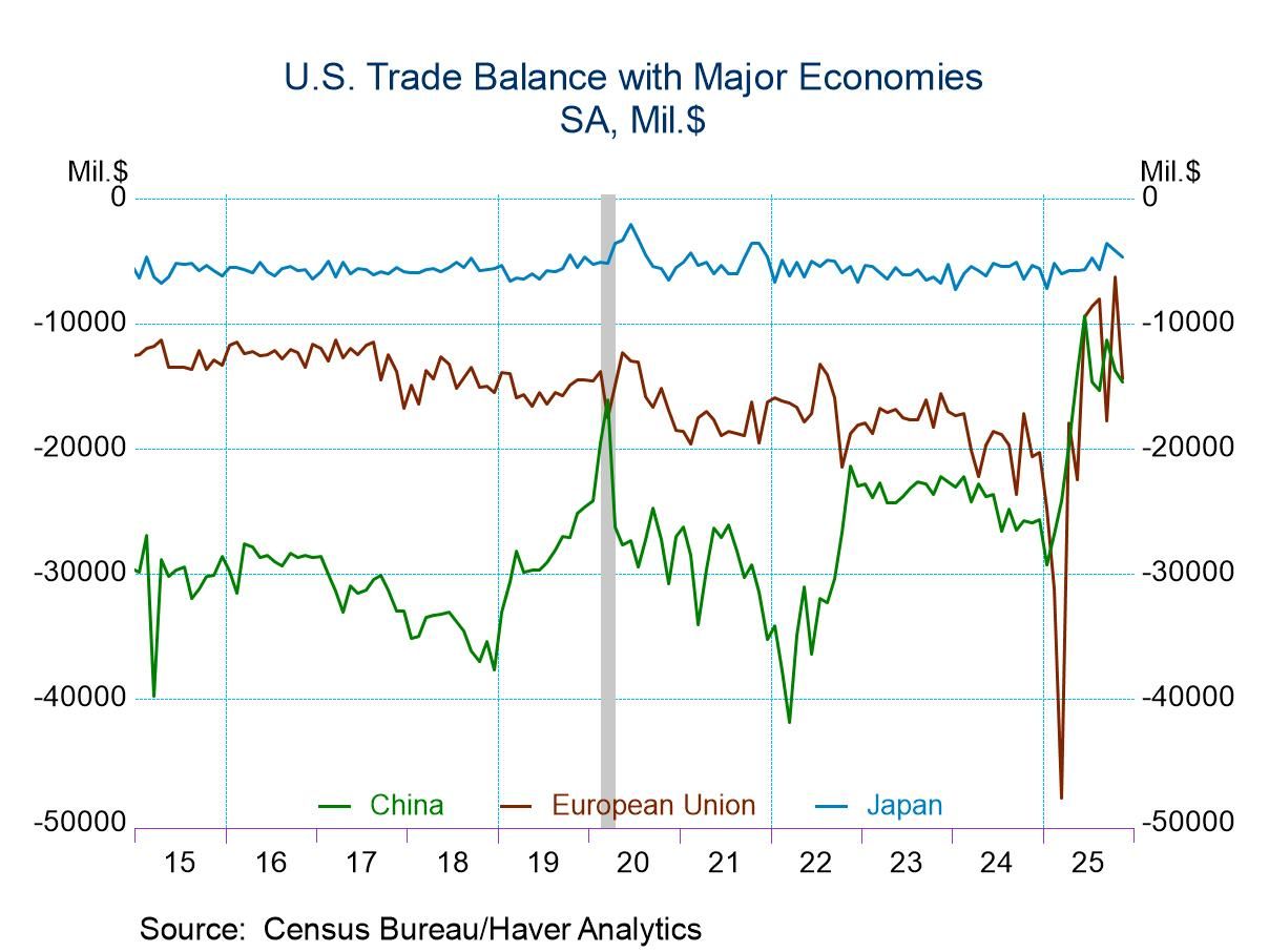 By country, the goods trade deficit with China widened to $14.7 billion in November from $13.7 billion in October. US exports to China slumped 19.4% m/m, the fourth monthly decline in the past five months. Imports from China declined 2.3% m/m, their third monthly decline in the past four months. The trade deficit with the European Union widened markedly to $14.5 billion in November from $6.3 billion in October. The deficit with Japan widened slightly to $4.7 billion from $4.2 billion.